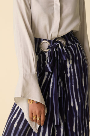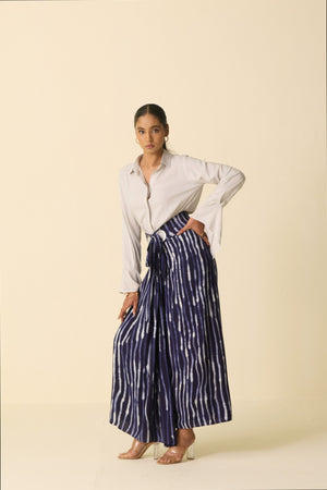 Crafted from breathable viscose rayon, this wrap skirt combines ease with sophistication. The deep blue base is adorned with hand-drawn white stripes, adding an artistic touch to its fluid silhouette. Pleated details and eyelet accents elevate the design, while the adjustable wrap style ensures a comfortable, flattering fit. Versatile enough for both casual outings and formal settings, this skirt brings effortless elegance to any wardrobe.