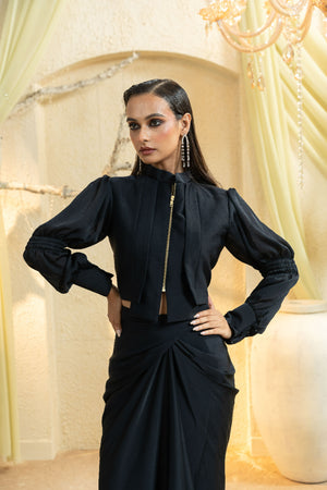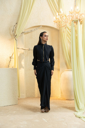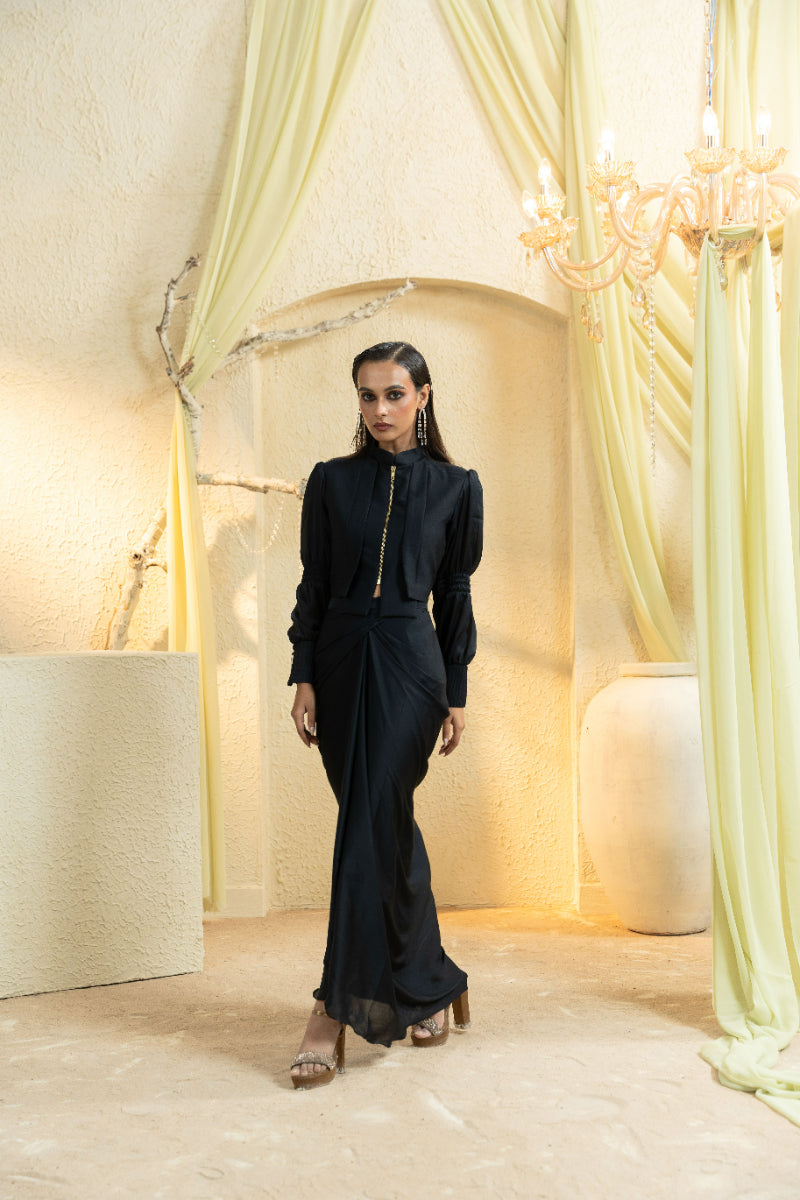 Tailored in a satin blend with a deep midnight hue, this drape set embodies sleek sophistication. The fluid silhouette is balanced by a refined wrap and artful gathers, creating a poised yet effortless look. Perfect for evening weddings, receptions, and high-profile celebrations where quiet luxury makes the statement.
