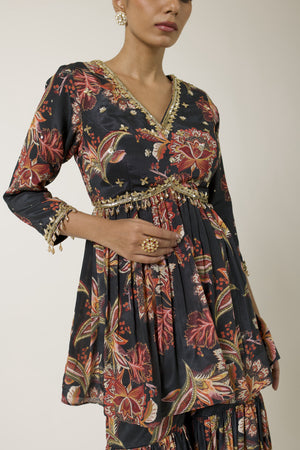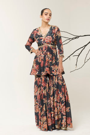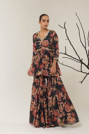 Floral printed peplum paired with a gharara , hand embellished with sequins and crystal tassels. Paired with a net dupatta to complete the look!