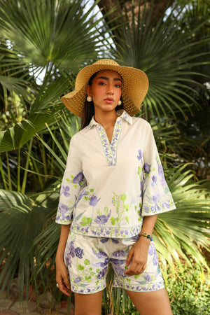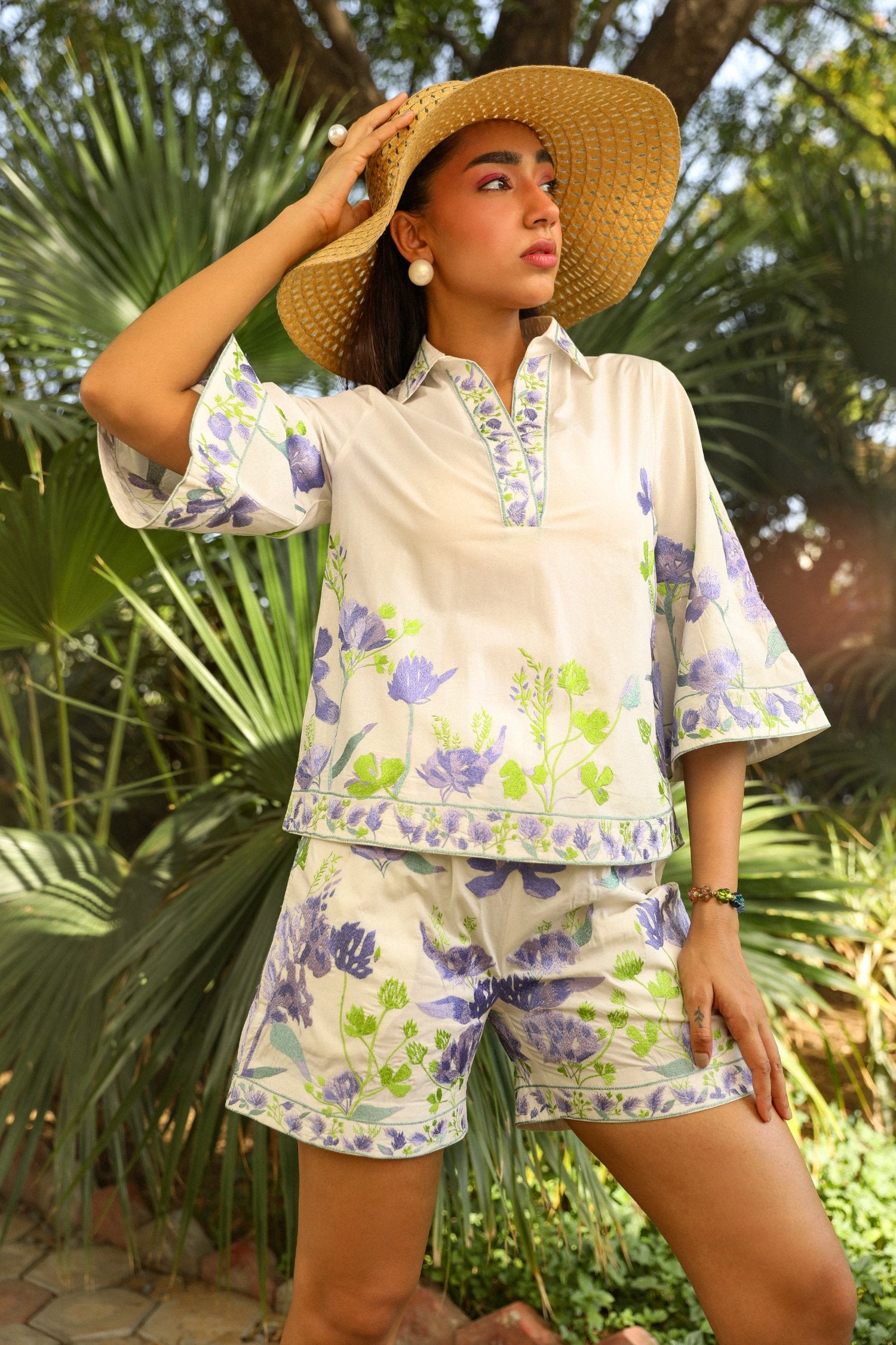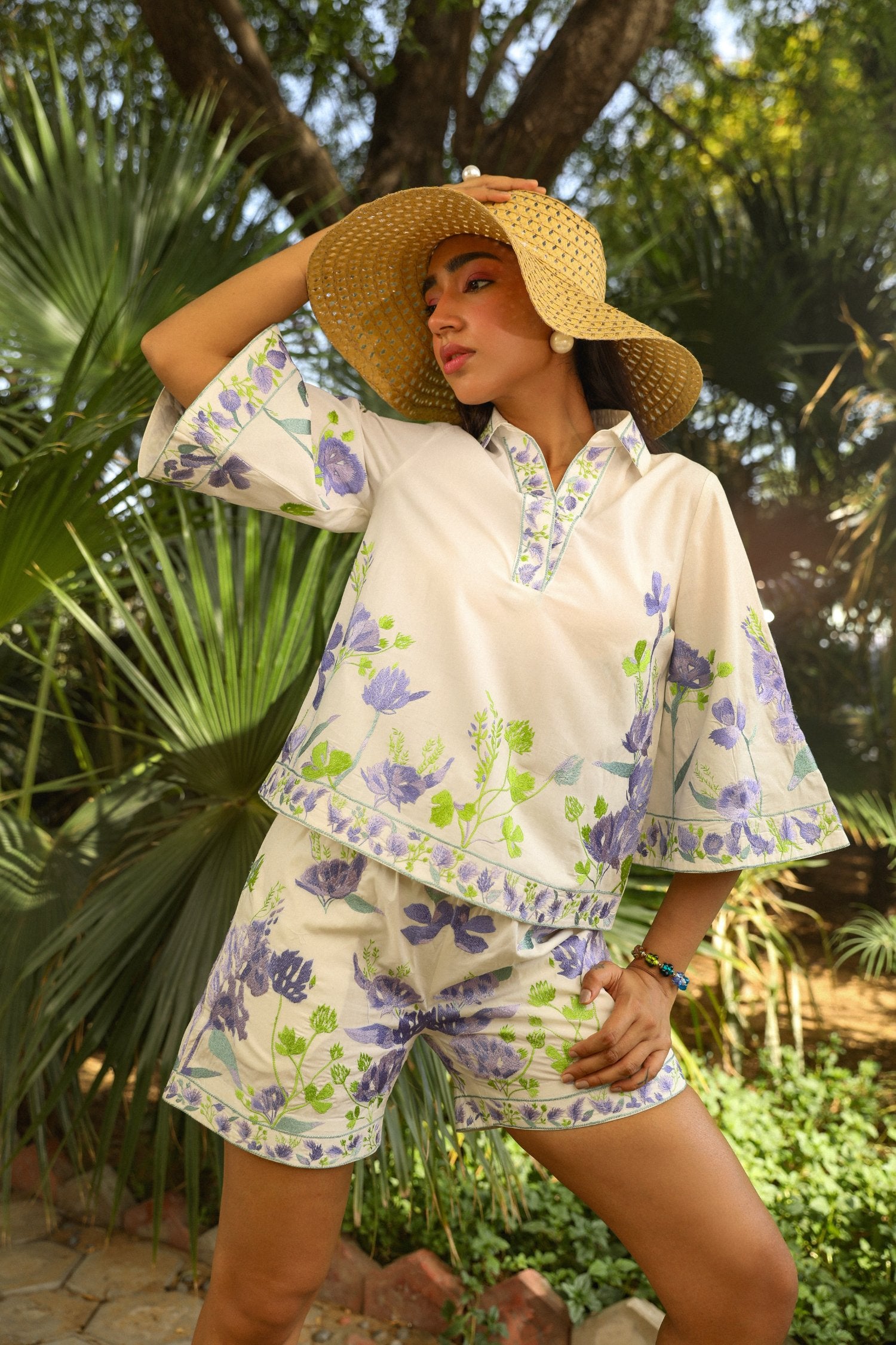 A white co-ord set in poplin fabric featuring a delightful floral print, perfect for a stylish and coordinated ensemble."