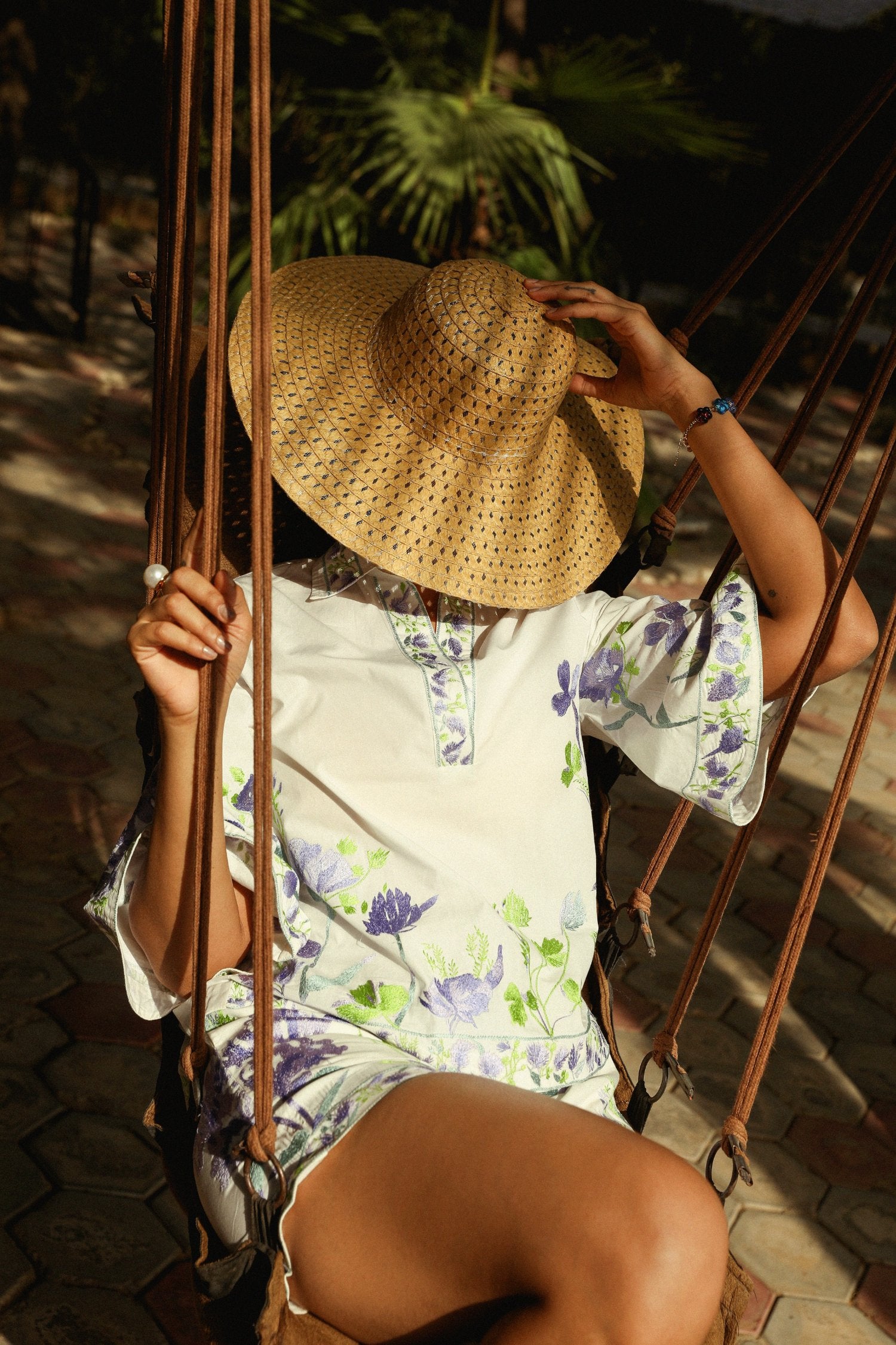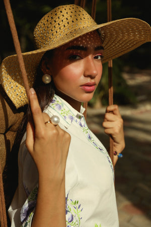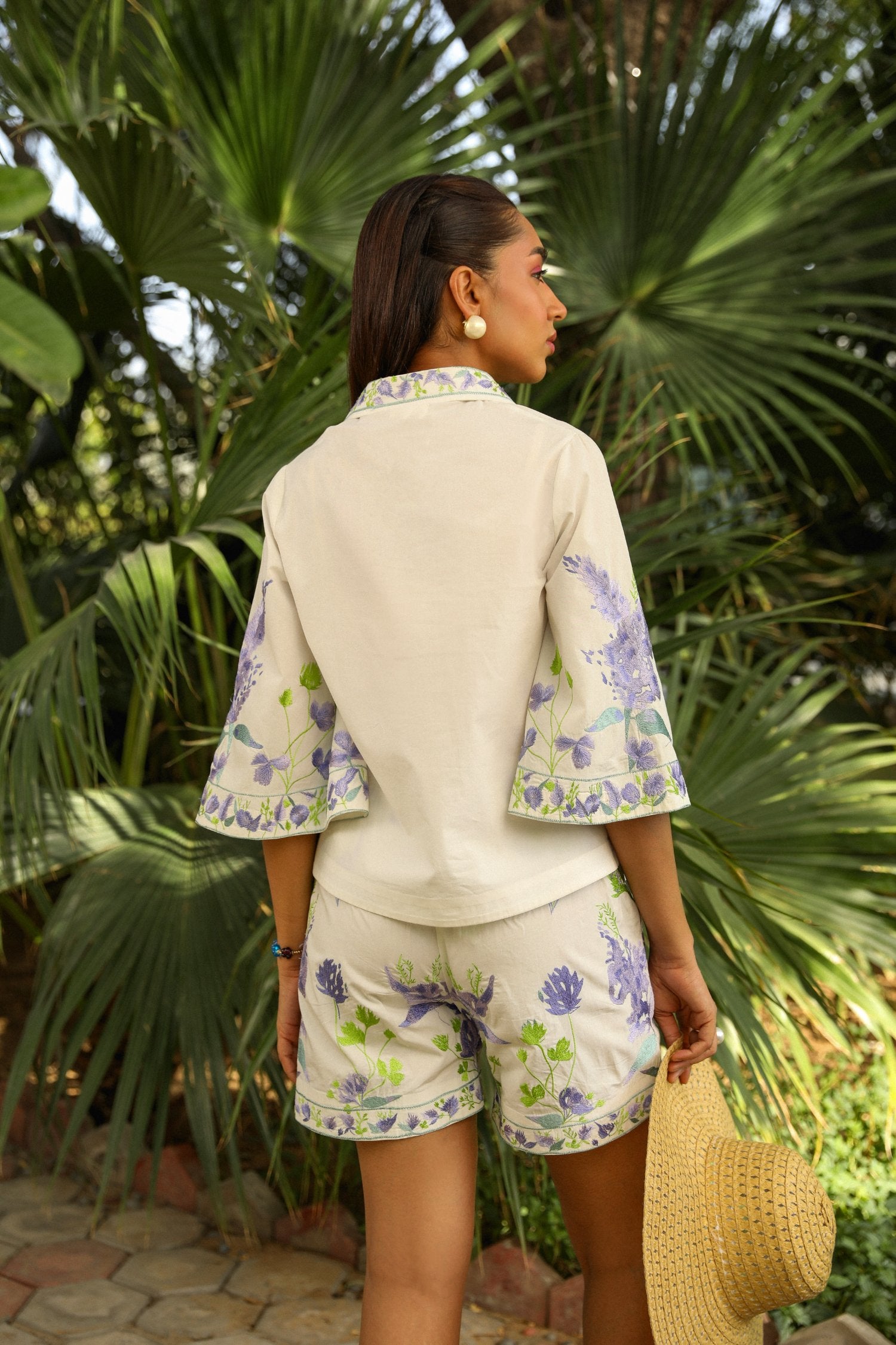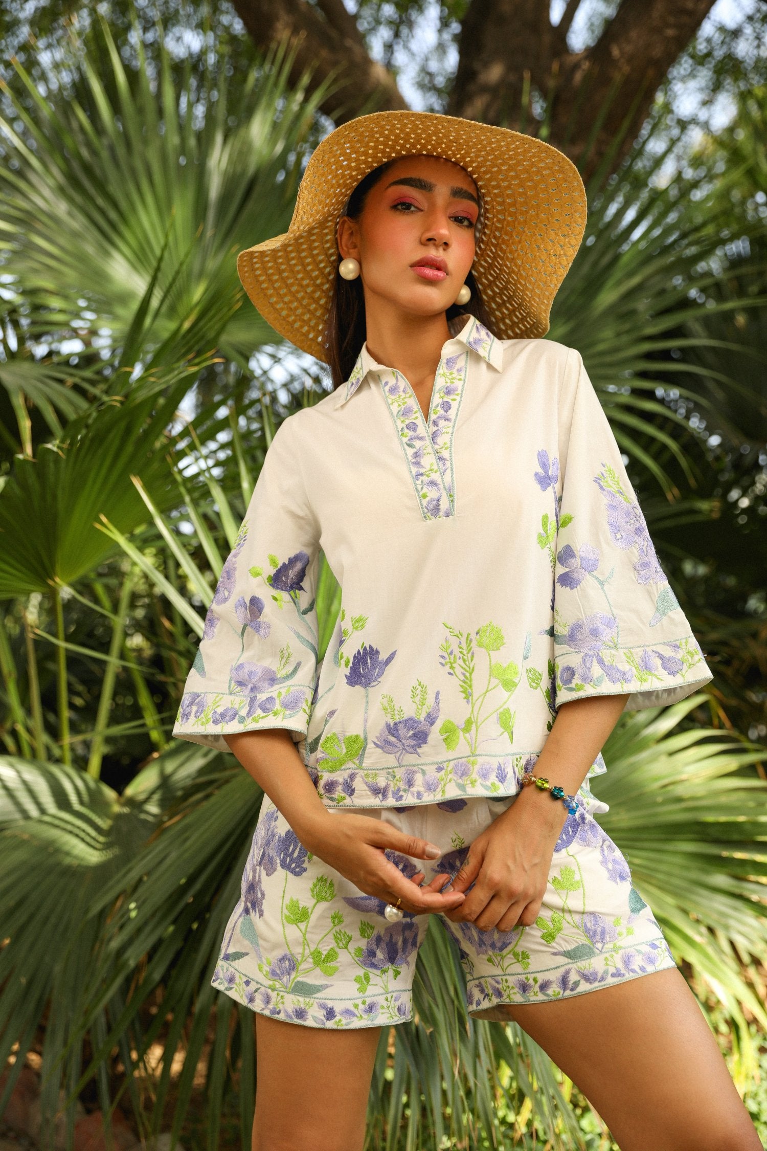 A white co-ord set in poplin fabric featuring a delightful floral print, perfect for a stylish and coordinated ensemble."