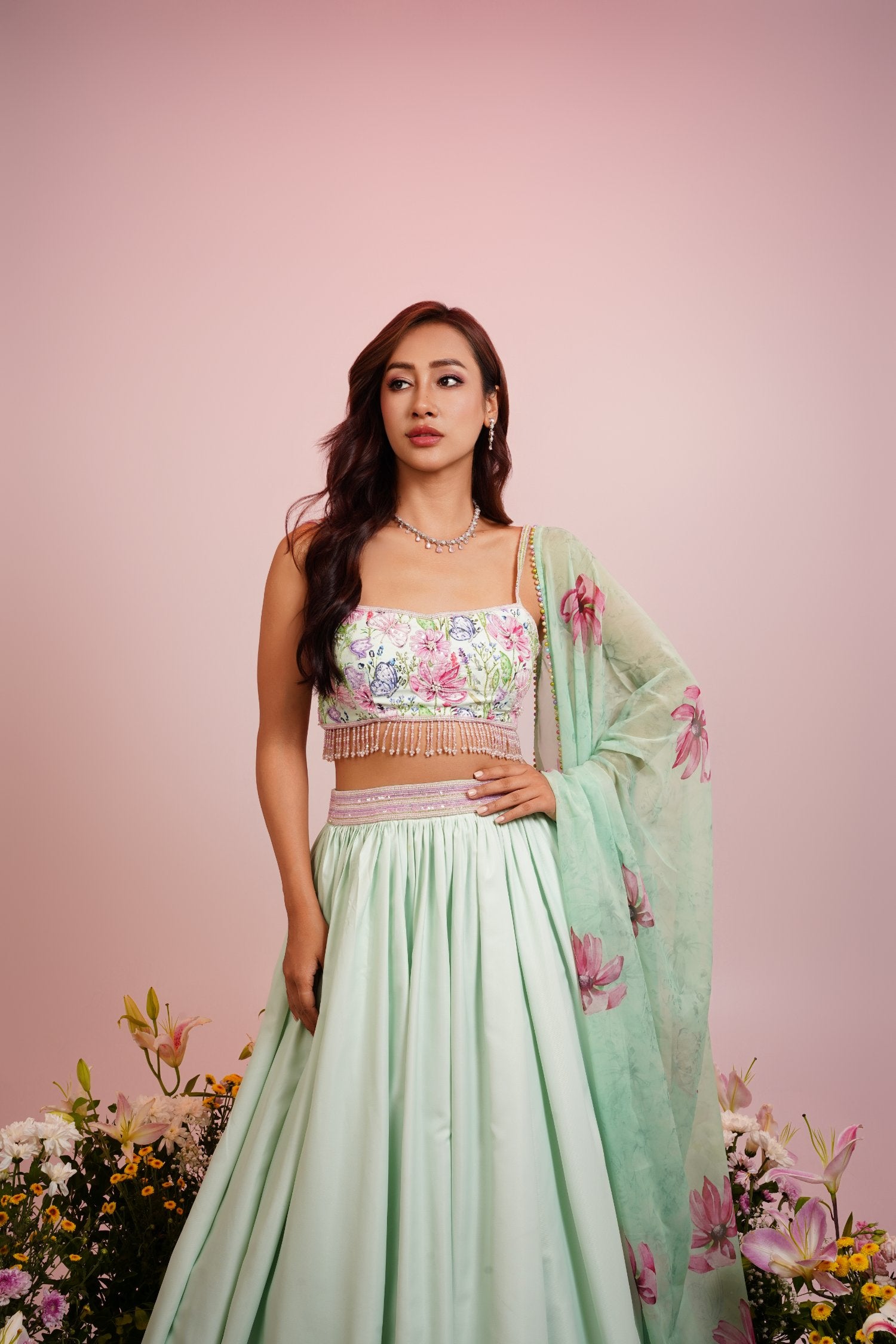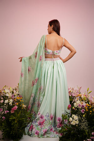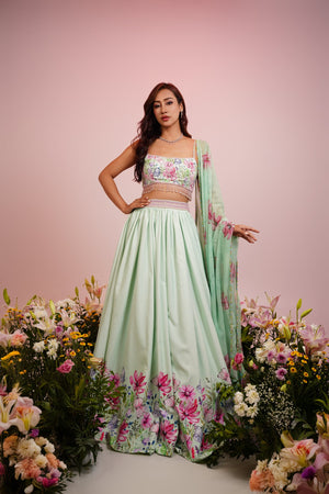 Mint green floral printed lehenga set with hand embroidered blouse complete the ensemble added with matching embellished dupatta