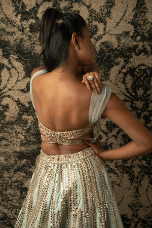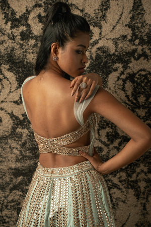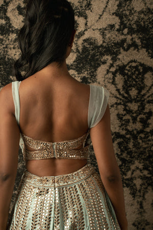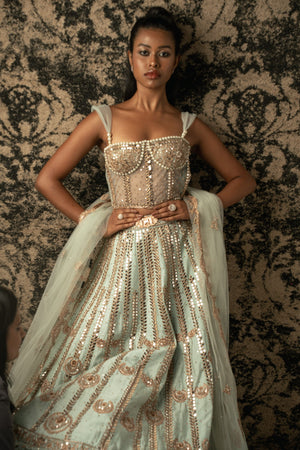 Mint Green Lehenga set with mirror embroidery. Embroidered corset with a dupatta that accentuates the whole set.
