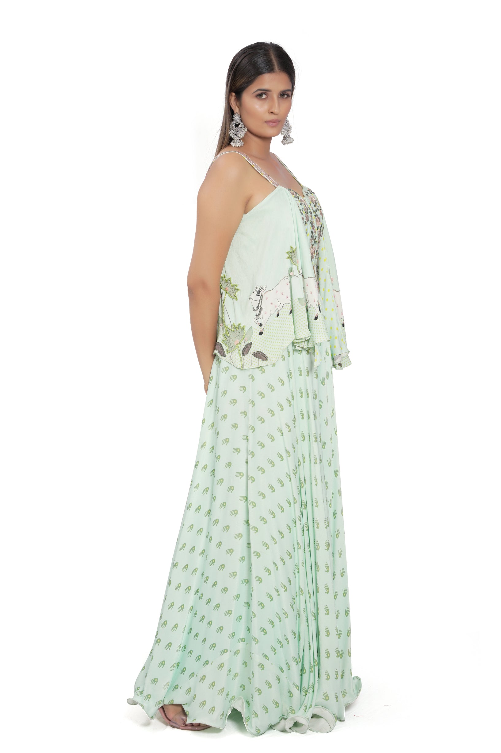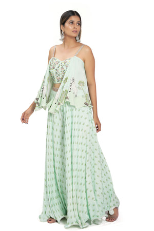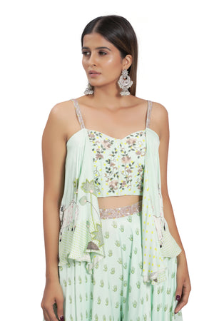 Featuring a mint green corset blouse in viscose base with hand embroidery and print, including an attached jacket. It is paired with matching satin flared palazzo pants.