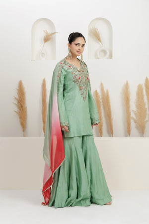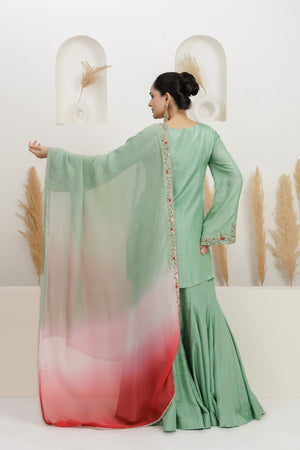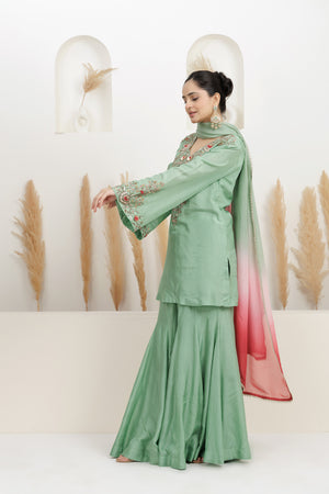 Mint Green Pure Bamber Silk Embroidered Sharara Set