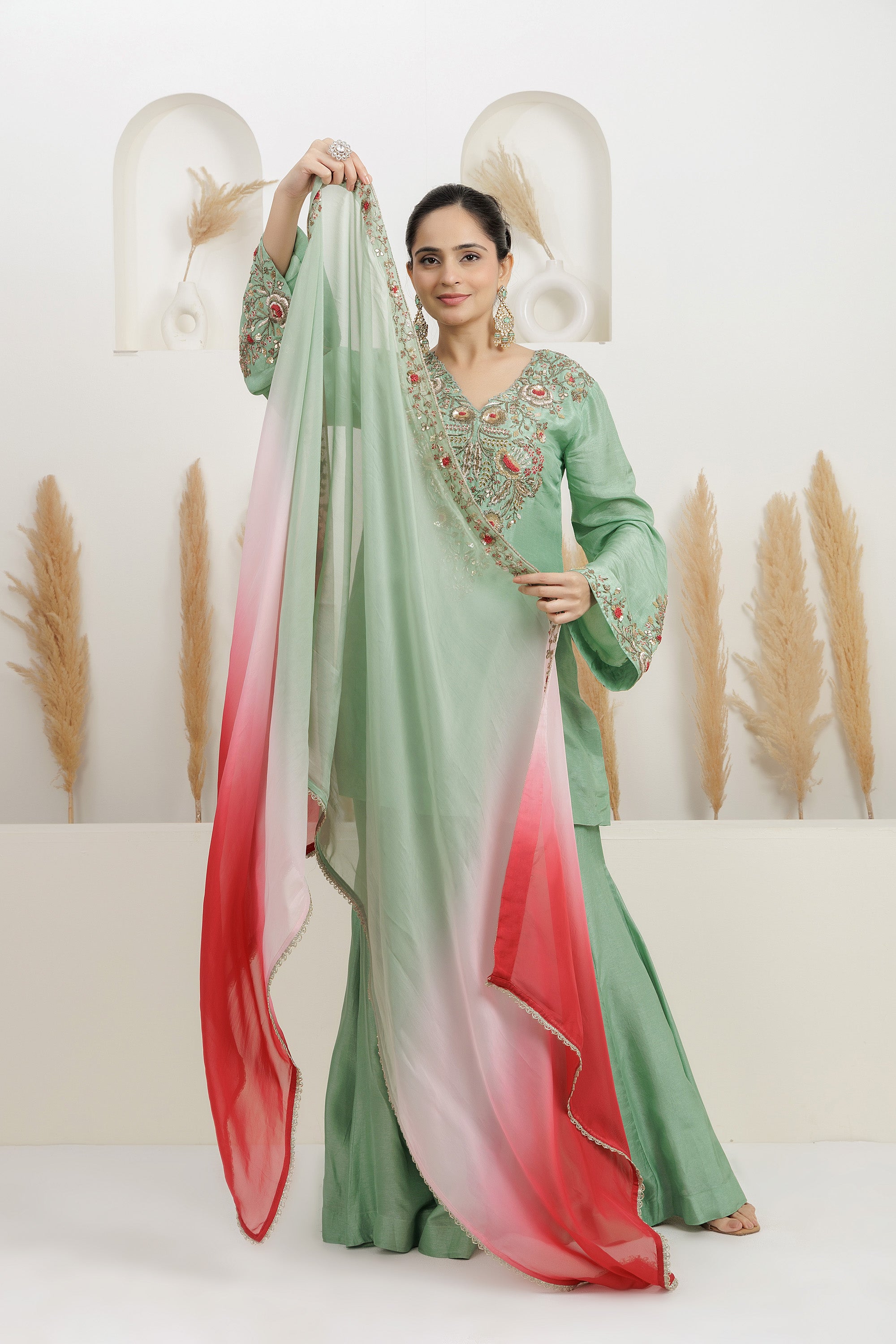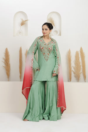 mint green kurta in pure bamber silk base with sequins, dabka, pearls, beads, and zari, gota-patti resham, embroidery. It is paired with sharara and dual shade organza scallop dupatta. The outfit is finished with detailing, Style it with dangler earrings and juttis for weddings or festive occasions.