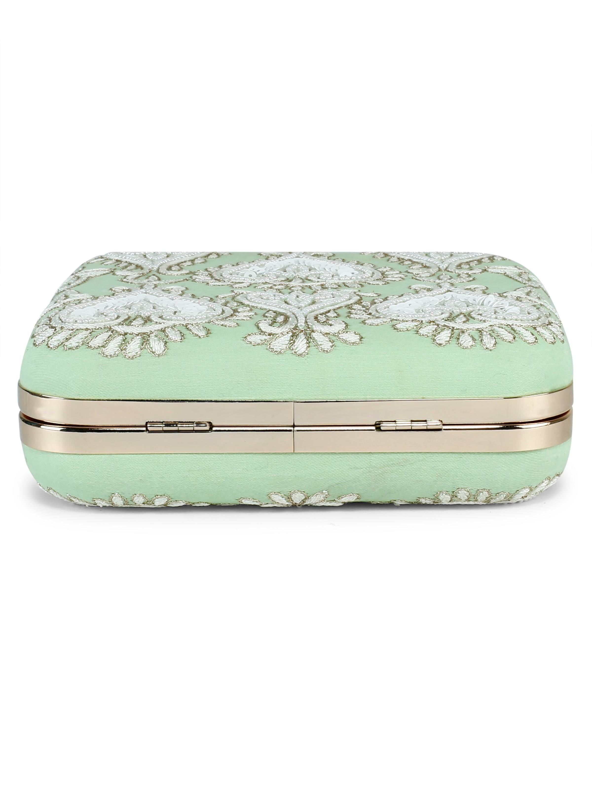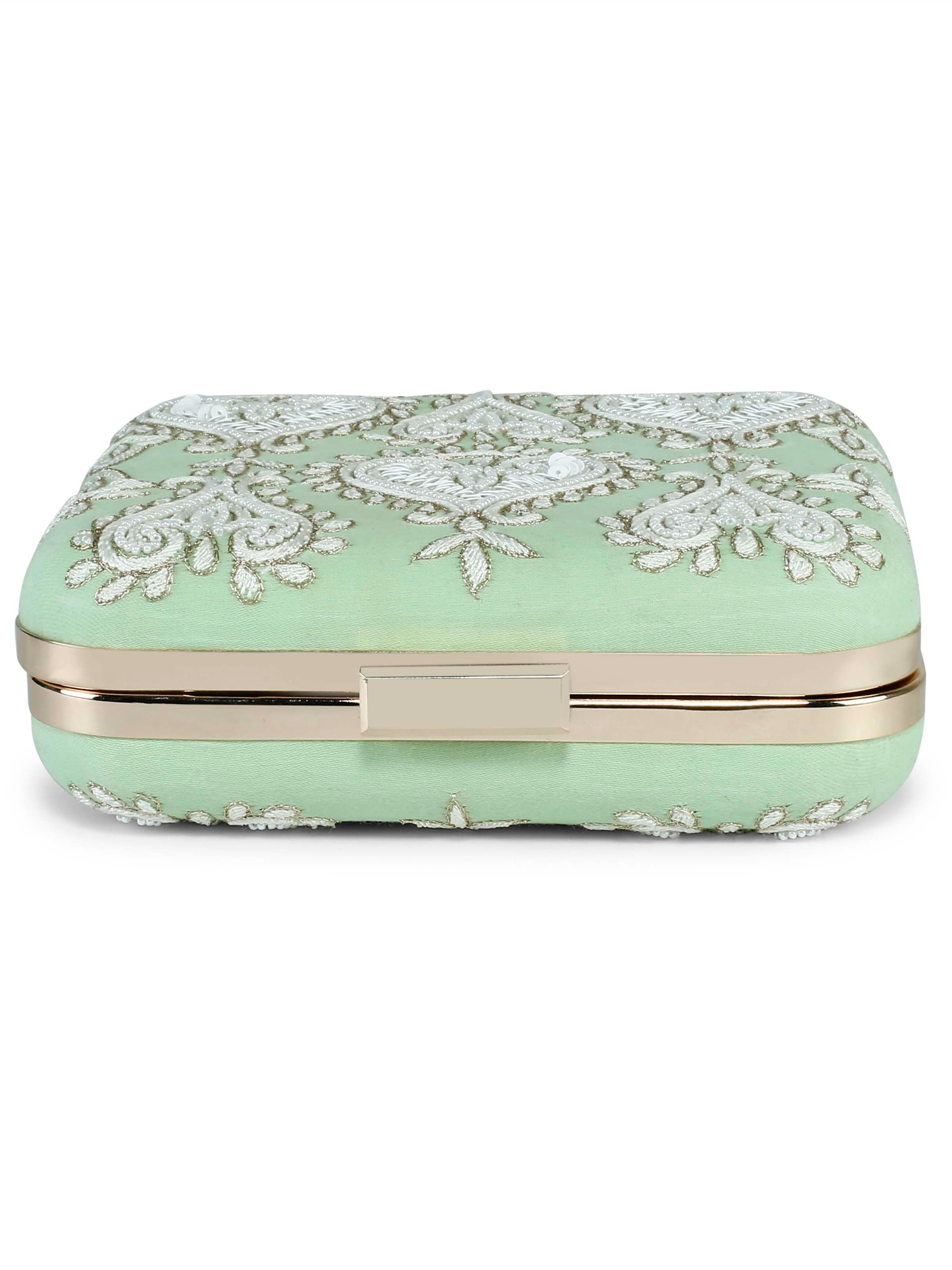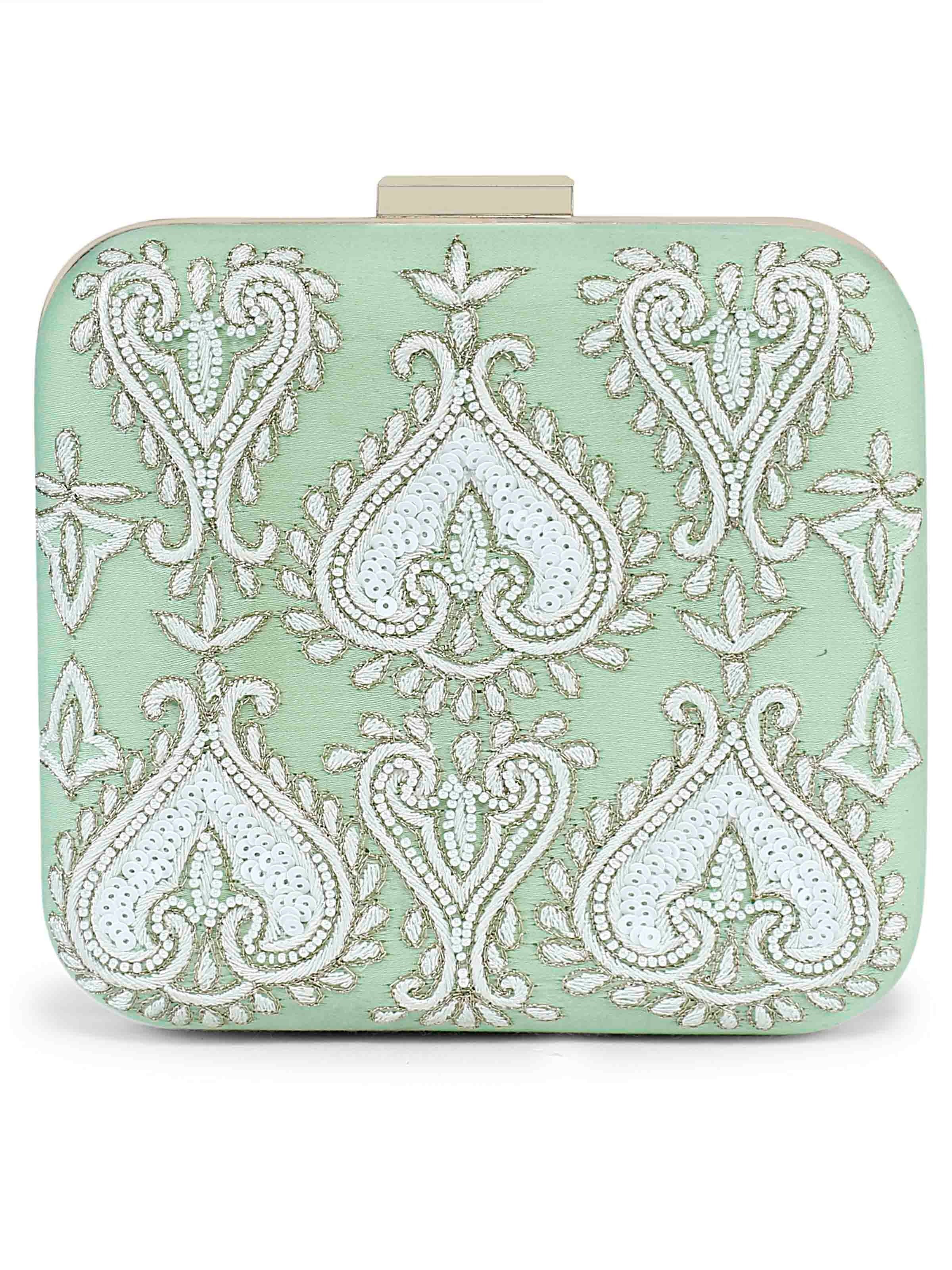 With scintillating design and hand embroidery this clutch bag comes with a detachable sling chain. Carry it with the chain or simply clutch it.