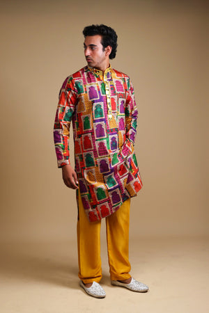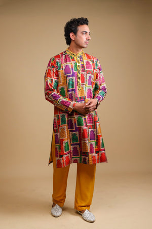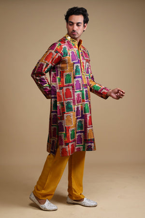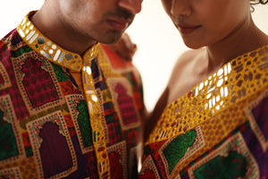 • This kurta features intricate mirror work detailing on the neck and placket that adds a touch of elegance and reflects traditional craftsmanship, making it perfect for festive occasions especially haldi ceremony.