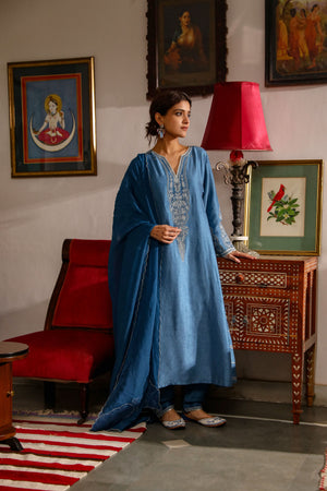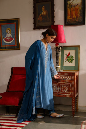 Cobalt blue embroidered kurta with darker tone pants and dupatta