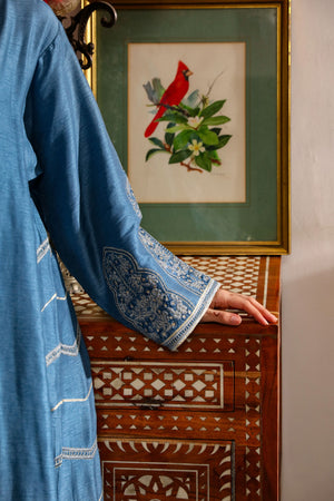 Mirza kurta set narrates a storyline of Mughal motifs and fine resham embroidered blended with intricate zari embroidery. The heritage embroidery design draws attention to the neckline and sleeves. The relaxed fit kurta silhouette with straight pants makes the style extra versatile. To top it all, the beautiful organza dupatta is precisely embroidered with scalloped edges and tonal embroidery motifs.