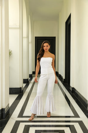 A white co-ord set consisting of a tube top and form-fitted pants, combining simplicity with sleek style for a sophisticated look.