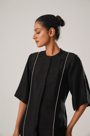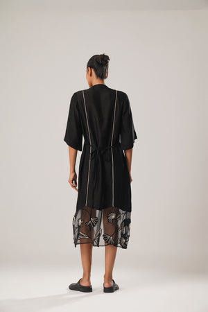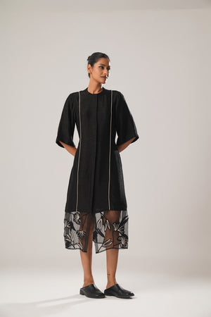 Make a statement with our Black Raw Silk Satin Dress, designed to captivate. This elegant dress features intricate dori work and handcrafted flowers, showcasing exceptional craftsmanship. The addition of an organza panel at the bottom elevates the look, adding a touch of ethereal sophistication and enhancing the dress’s graceful silhouette. Perfect for any special occasion, this dress combines luxury and artistry for a truly standout appearance.