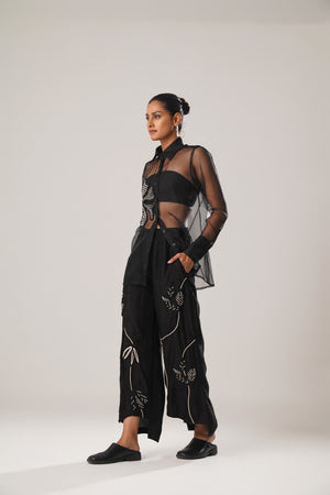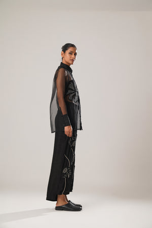 Elevate your wardrobe with our Black Silk Organza Shirt, a blend of sophistication and artistry. This shirt features handcrafted flowers delicately detailed on the front and cuffs, adding a touch of unique elegance. Made from luxurious silk organza, it offers a refined, sheer texture that enhances its sophisticated silhouette. Perfect for both formal and stylishly casual occasions, this shirt is a standout piece that effortlessly combines classic charm with modern flair.