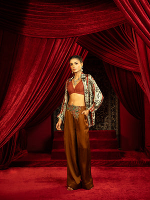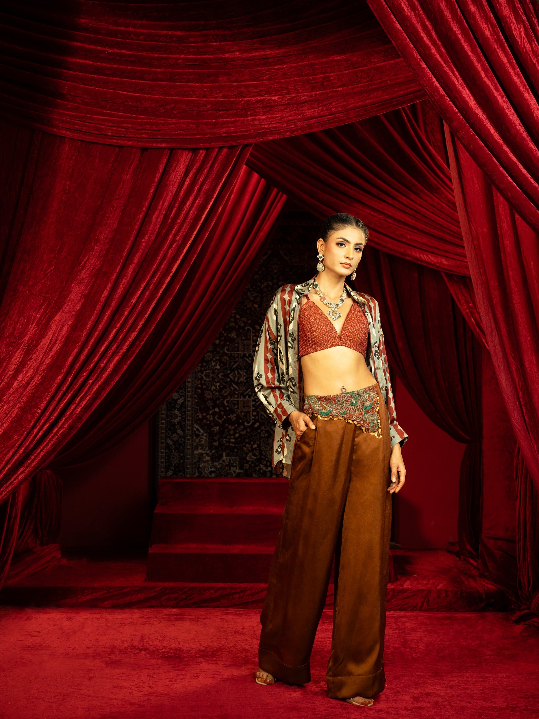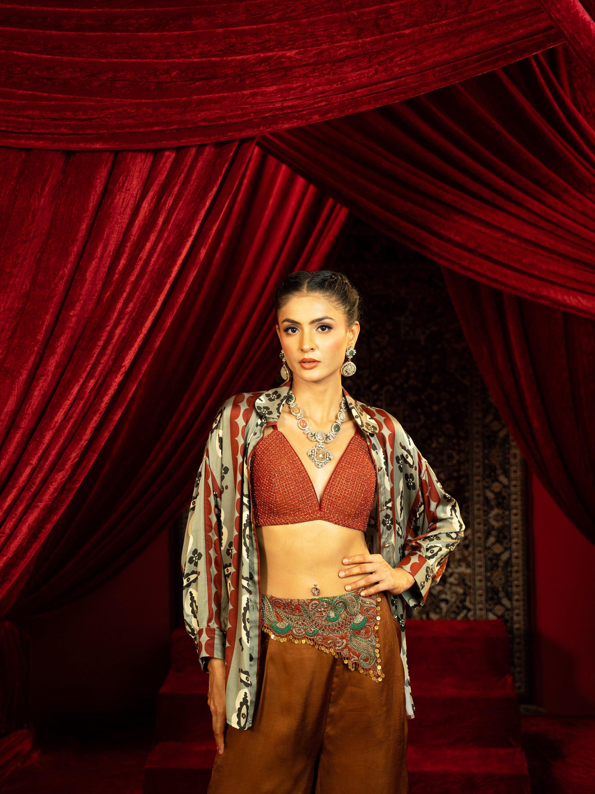 A contemporary fusion ensemble, featuring boxy pants with an embroidered belt flap and side pockets, paired with a printed satin boho shirt. Styled with a crimson red chanderi tissue bralette quilted with multicolor beads (for styling only), this look effortlessly balances modern silhouettes with artisanal detailing. Perfect for daytime parties, casual festive events, or modern fusion occasions.