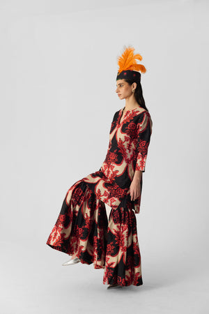 The set includes a short-length kurta with a flattering slight V-neckline and 3/4th sleeves, lined with soft mulmul for added comfort. The sharara is designed with side pockets for convenience, and its flowing flares offer a perfect fit with a graceful, voluminous silhouette. This set beautifully blends tradition with modern comfort.