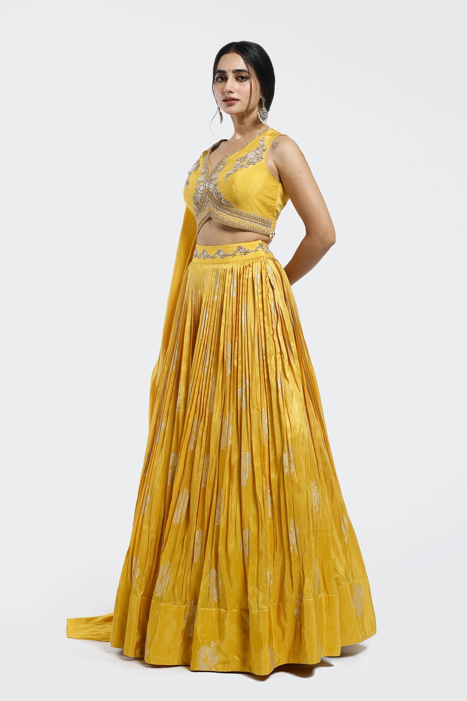 Embellished Bemberg Silk co-ord set featuring a mono-sleeve crop top with tassel details and an A-line skirt. Embellishments include sequins, Dabka, pearl and cheed