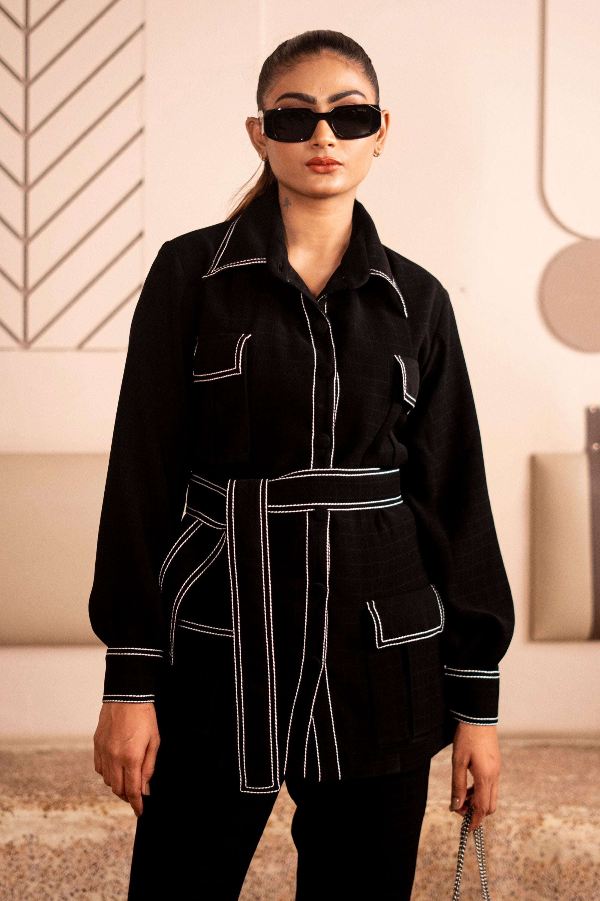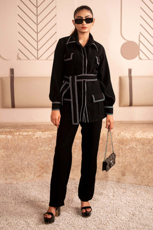 The black Armani co-ord is a total showstopper. It's sleek, stylish, and perfect for any occasion. The coat features a unique pattern that adds a touch of sophistication. With its tailored fit and high-quality construction, it's bound to make you look and feel amazing. Whether you're dressing up for a special event or just want to add a touch of elegance to your everyday look, this co-ord is a must-have. overall this outfit is sure to make a Bold fashion statement