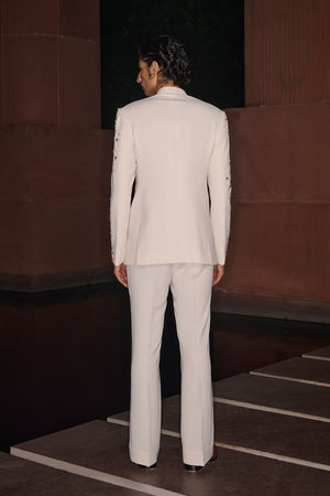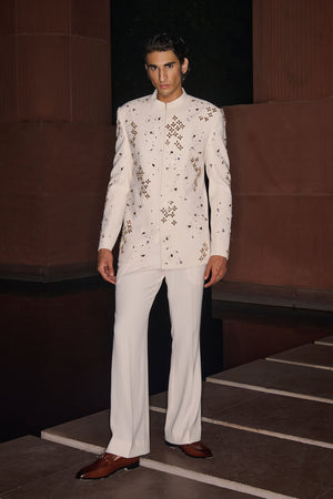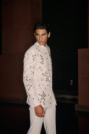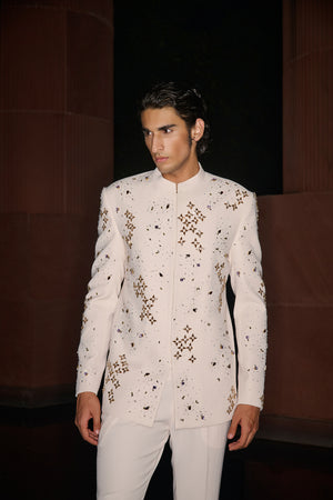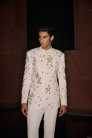An off-white bandhgala featuring intricate geometric motifs, adorned with shimmering crystals and stones, paired with matching pants