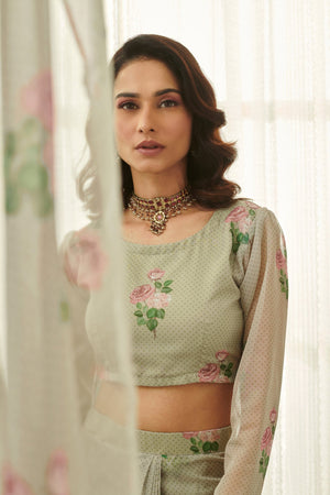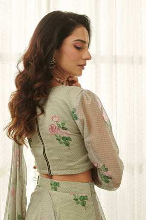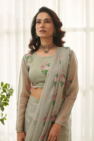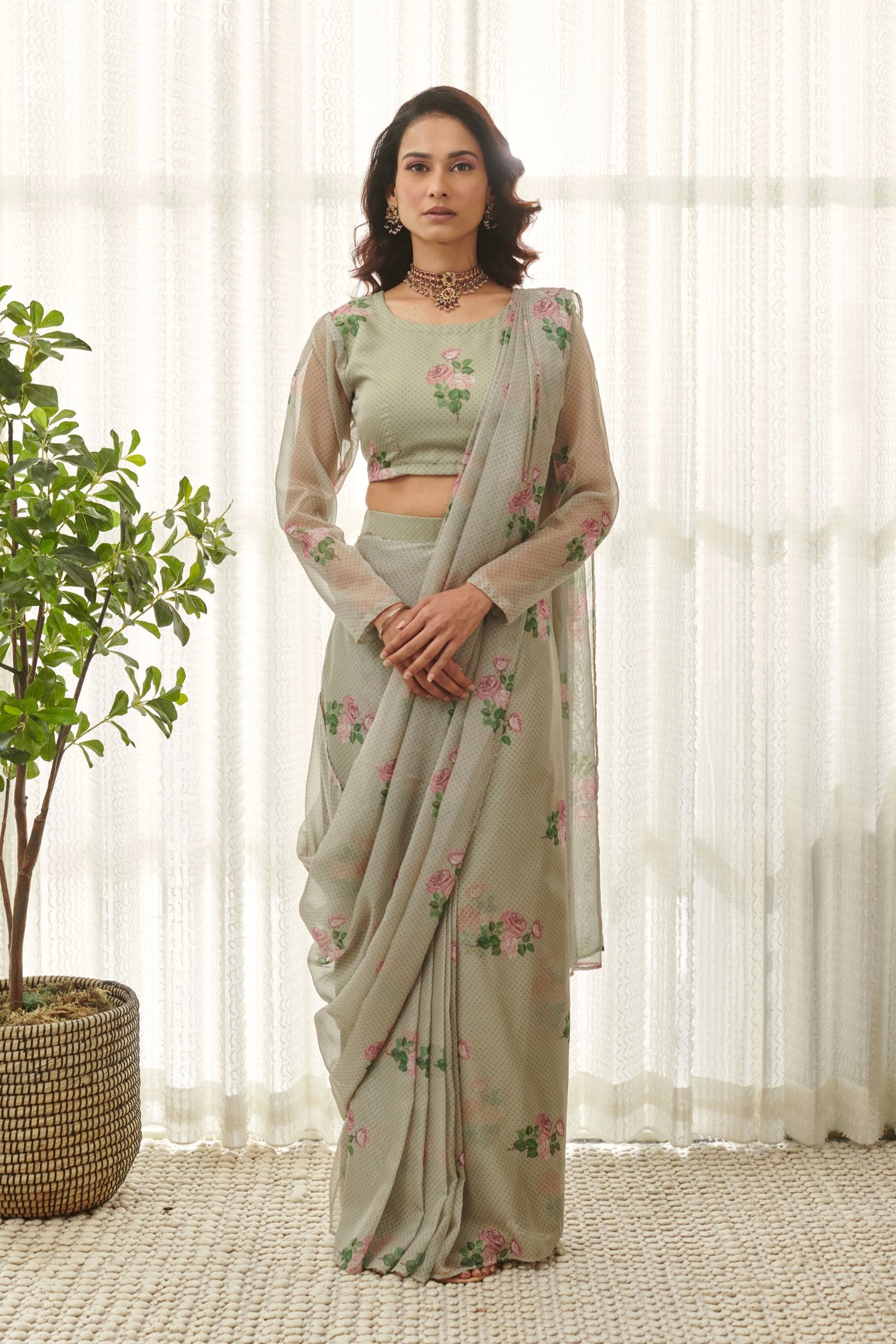 This ready-made saree set is perfect for easy, fuss-free styling. The saree is pre-draped, so you can just slip it on without any hassle. It comes with a matching, stitched blouse for a complete look. The floral print adds a fresh and elegant touch, making it perfect for any special occasion!