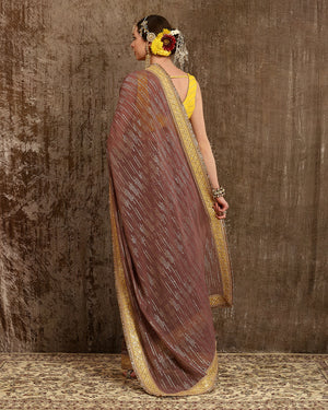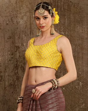 This Mouse saree is symbolic of elegance. It is made out of Georgette fabric. There is fine detailing of Dori, Badla and Kasab work. This saree is paired with a Lime yellow Chanderi blouse with Gota work. This blouse beautifully complements the saree providing the outfit a classic look!