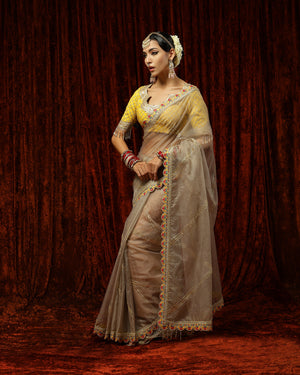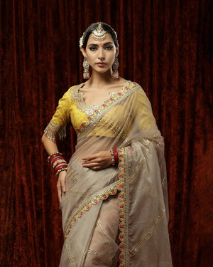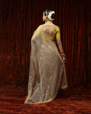 Thes is a beautiful mouse organza saree with exquisite detailing of Badla and Kasab work and Hyderabadi micro pearls. This saree is paired with a Yellow blouse with rose gold gota, pearl and crystal drop detailing. This blouse beautifully complements the saree providing the outfit a classic look!