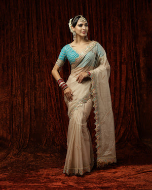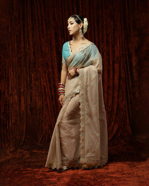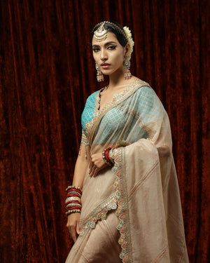 Thes is a beautiful Mouse & Turquoise organza saree with exquisite detailing of Badla and Kasab work and Hyderabadi micro pearls. This saree is paired with a Turquoise blouse with rose gold gota, pearl and crystal drop detailing. This blouse beautifully complements the saree providing the outfit a classic look!