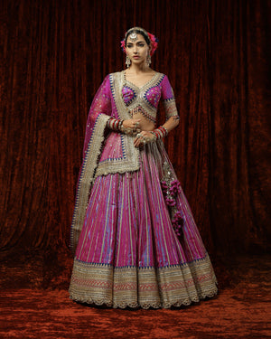 Featuring Orchid lehenga in Simmer Chanderi Purple touch gota and dori embroidery. Lehenga completes looks with net dupatta and matching blouse. Entire ensemble is exquisite in itself because of its color and the beautiful embroidery.