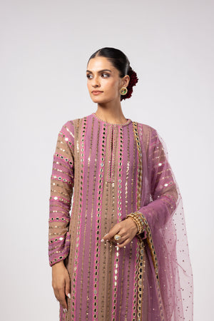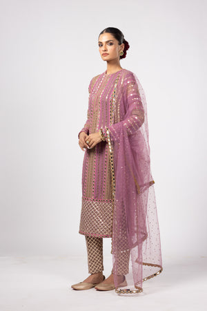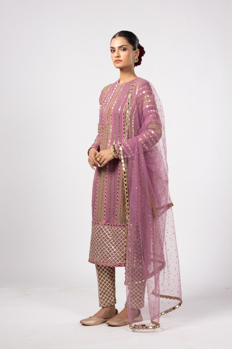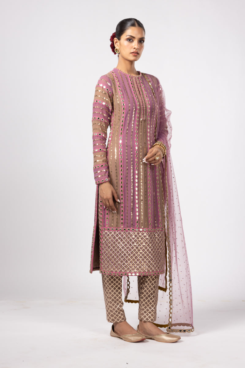 A Vibrant Multicolor Kurta In Mud Mauve, Deep Beige And Dark Blush Tones, Adorned With Golden Gota Embroidery, Paired With Golden Gota Embroidered Pant And Dupatta Set.