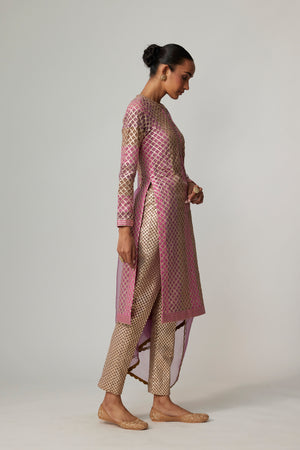 A Vibrant Multicolor Kurta In Deep Beige, Mud Mauve, Dark Blush Tones, Adorned With Golden Gota Embroidery, Paired With A Straight Pants And Dupatta Set