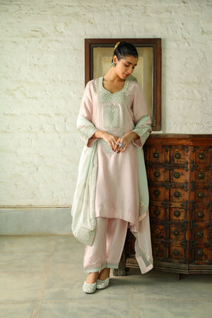 Powder pink & powder green embroidered kurta with tonal pants and dupatta
