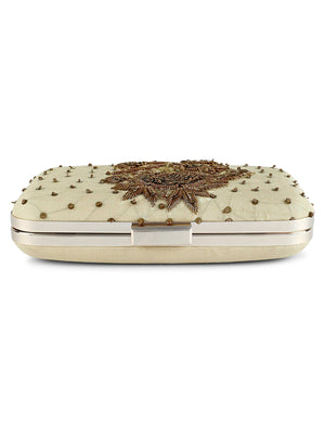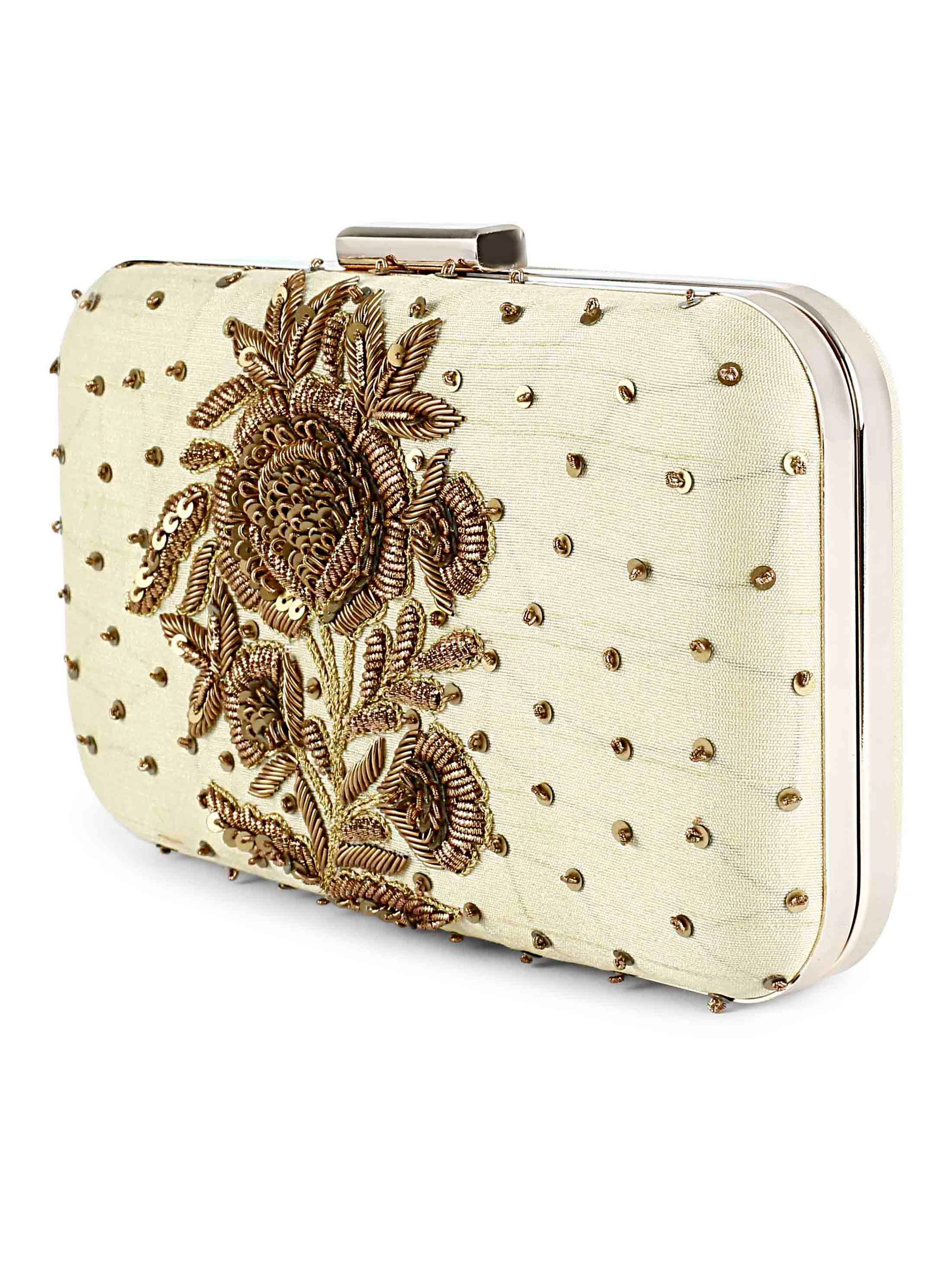 With scintillating design and hand embroidery this clutch bag comes with a detachable sling chain. Carry it with the chain or simply clutch it.
