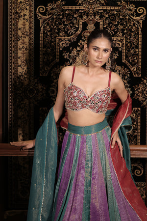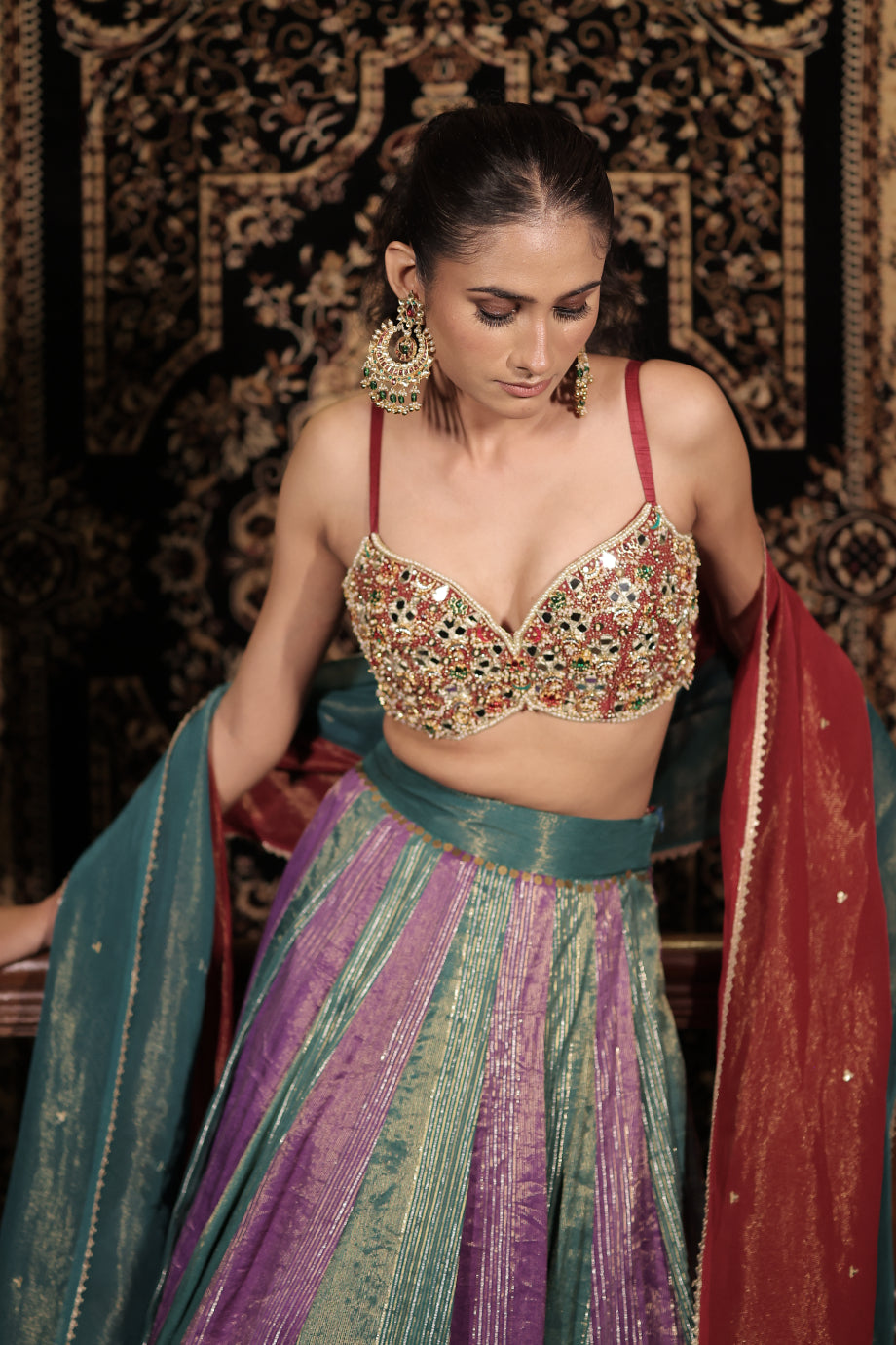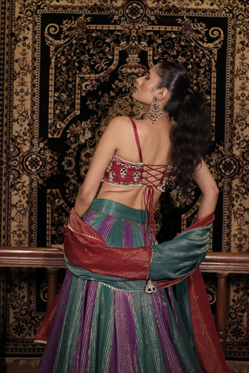 Featuring a multi-colored lehenga in banarasi base. It is paired with a tissue blouse having kundan, sequins, mirror and pearl embellishment, including a maroon dupatta. Accentuate it with traditional gold jewellery and heels, perfect for weddings, sangeet and festive celebrations.