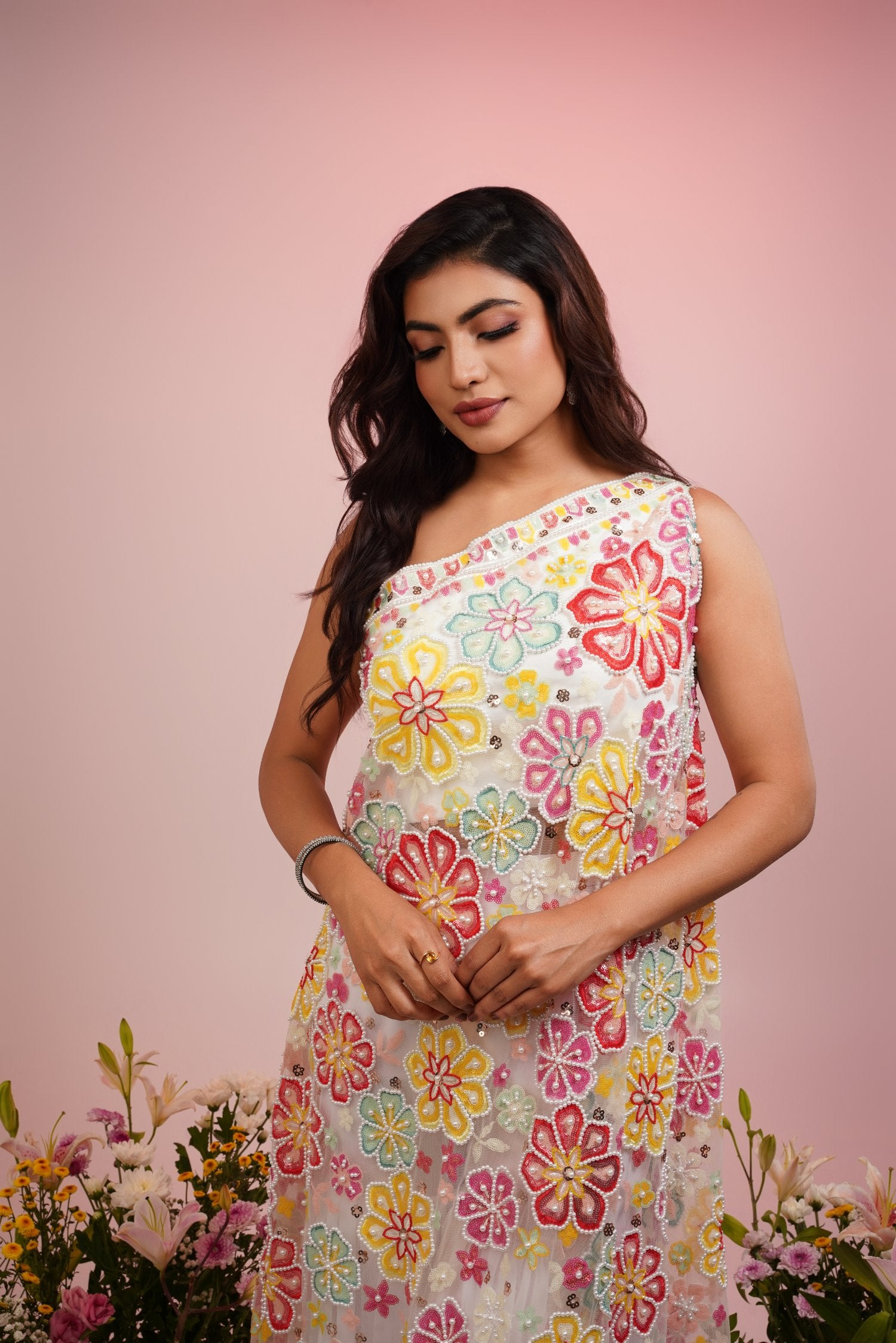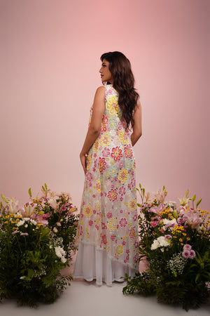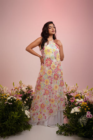 This Multi colour flower dress set is paired up with embroidered kurta & Georgette sharara looks great to own for any occasions for Indian festivals and functions.