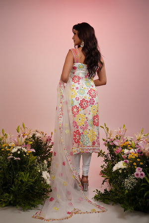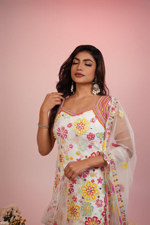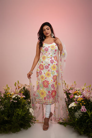 This Multi colour flower Kurta set is paired up with embroidered kurta Georgette dupatta looks great to own for any occasions for Indian festivals and functions.