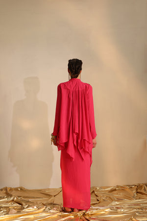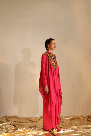 Yoke gather flared top embellished with multi-colored and metallic paired with a draped skirt