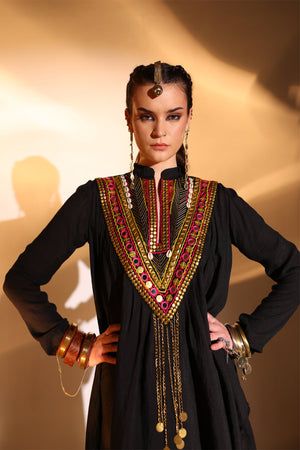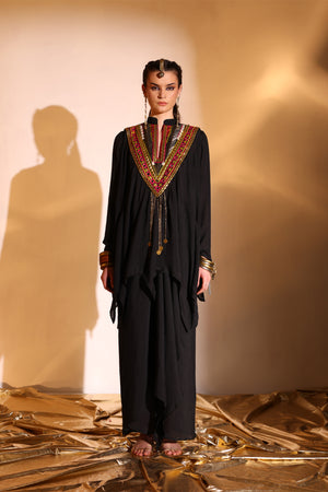 Yoke gather flared top embellished with multi-colored and metallic embroidery paired with a draped skirt