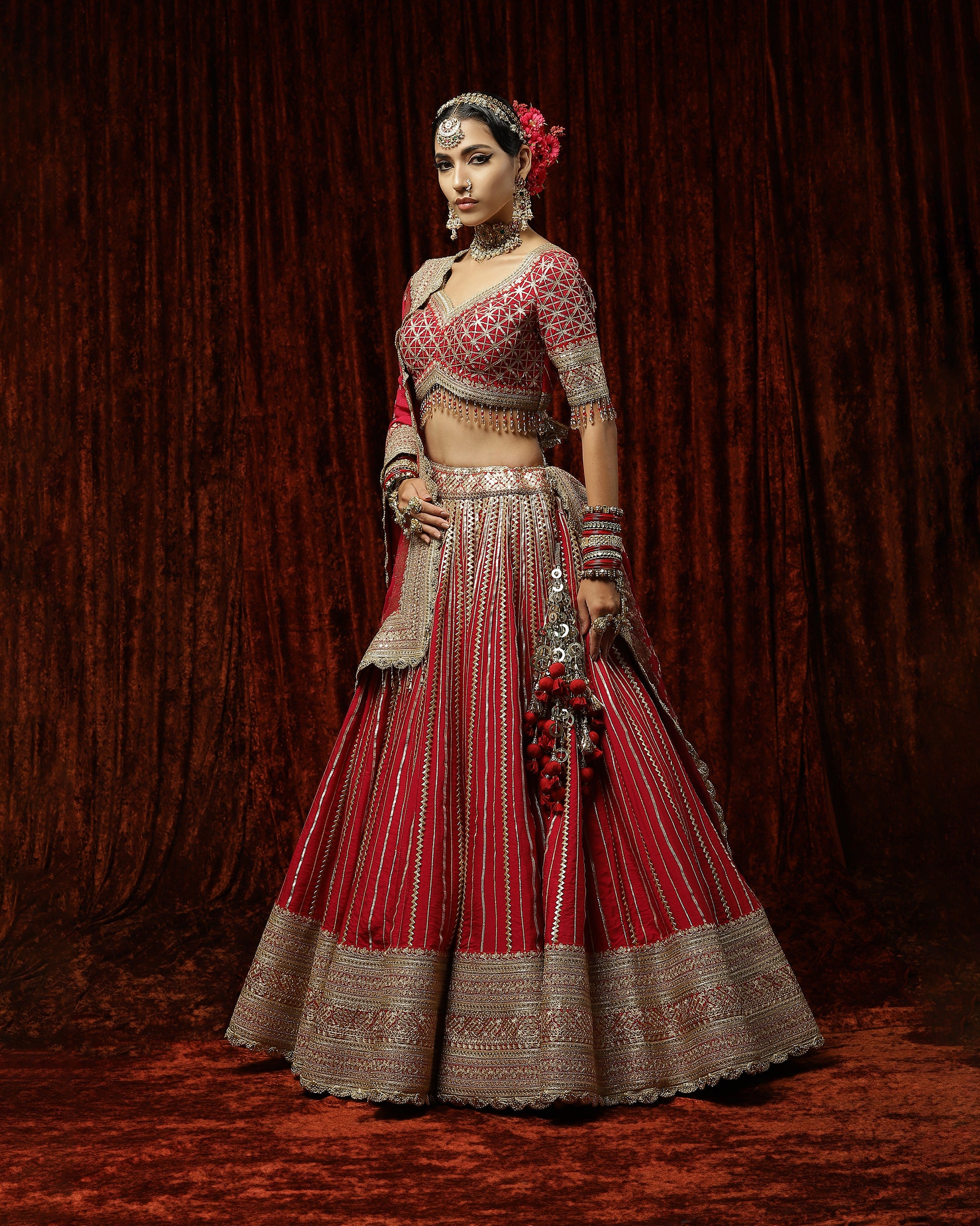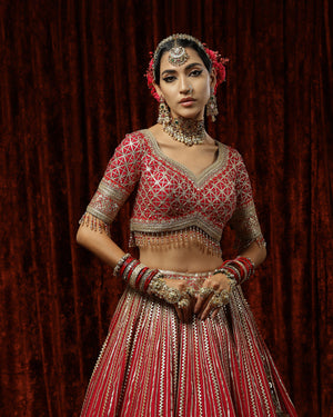 The Uniqueness of this lehenga lies in its style itself. This lehenga is made of Silk Chanderi. The lehenga is adorned with fine gota, dori and badla work. and tassles thus providing it the perfect style and grace. It is paired with a Chanderi blouse and georgette duppta that perfectly complements the lehenga to give it an exquisite look.