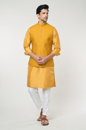 Mustard raw silk based jacket, enhanced with thread embroidery, paired with a matching cotton silk based kurta and an off white dupion silk based mexcian pants.