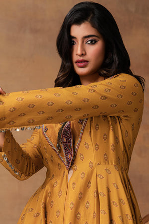 This mustard gold and brown printed, asymmetrical Kurta Set is where tradition meets striking contemporary design. Crafted in mughal booti printed light Chanderi fabric, the silhouette flows effortlessly. The highlight of the piece is the contrast-embroidered yoke, detailed with fine dori and beadwork, forming an artful frame. Adding to the subtle drama are handmade tassels — playful yet refined — that sway with every step, giving the look a festive soul - making it perfect for festive days, mehendi lunches, or destination gatherings.