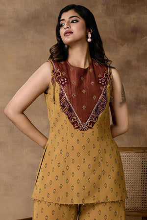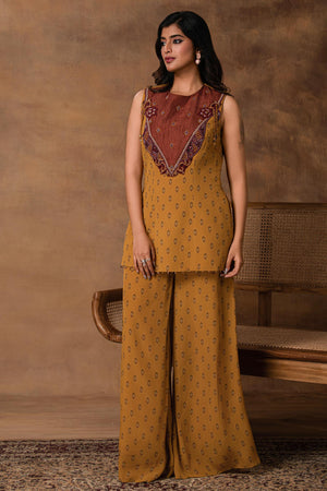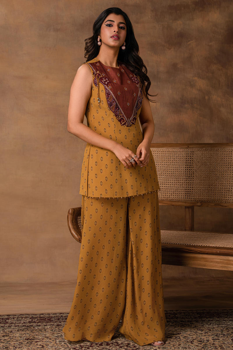 Featured here is Top and pant set crafted in crepe, featuring all-over Mughal-inspired floral bootis in a complimentary print palette of mustard gold and brown. A statement yoke panel embellished with intricate dori and bead embroidery, creating a focal point of subtle sparkle. Handmade tassels dangle playfully from the yoke, adding movement and just the right amount of festive drama. The relaxed silhouette flows gracefully on the body, offering all-day comfort with elevated sophistication. From destination weddings and intimate mehendis to cocktail dinners and family celebrations, this set is your go-to for making an impact with minimum effort.
