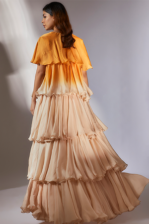 Featuring Mustard to Beige Ombre Ruffle Jacket in Satin Organza with Beige Embroidered Pant Set
