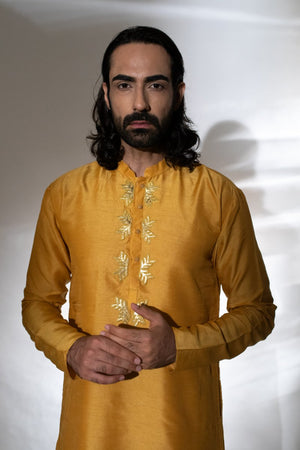 Mustard yellow kurta with applique work, paired with pant pajamas. Kurta length- 44" .The colour may slightly vary due to screen lighting.