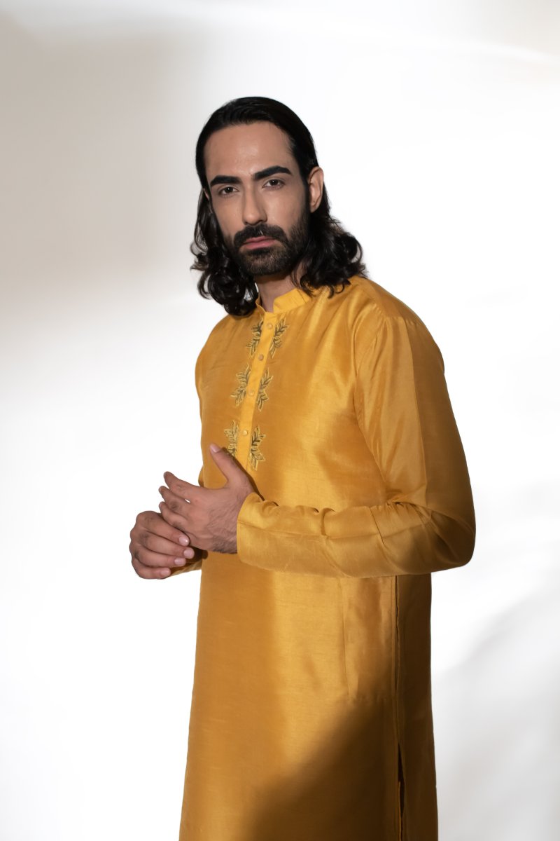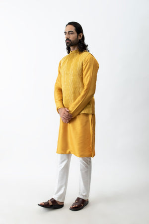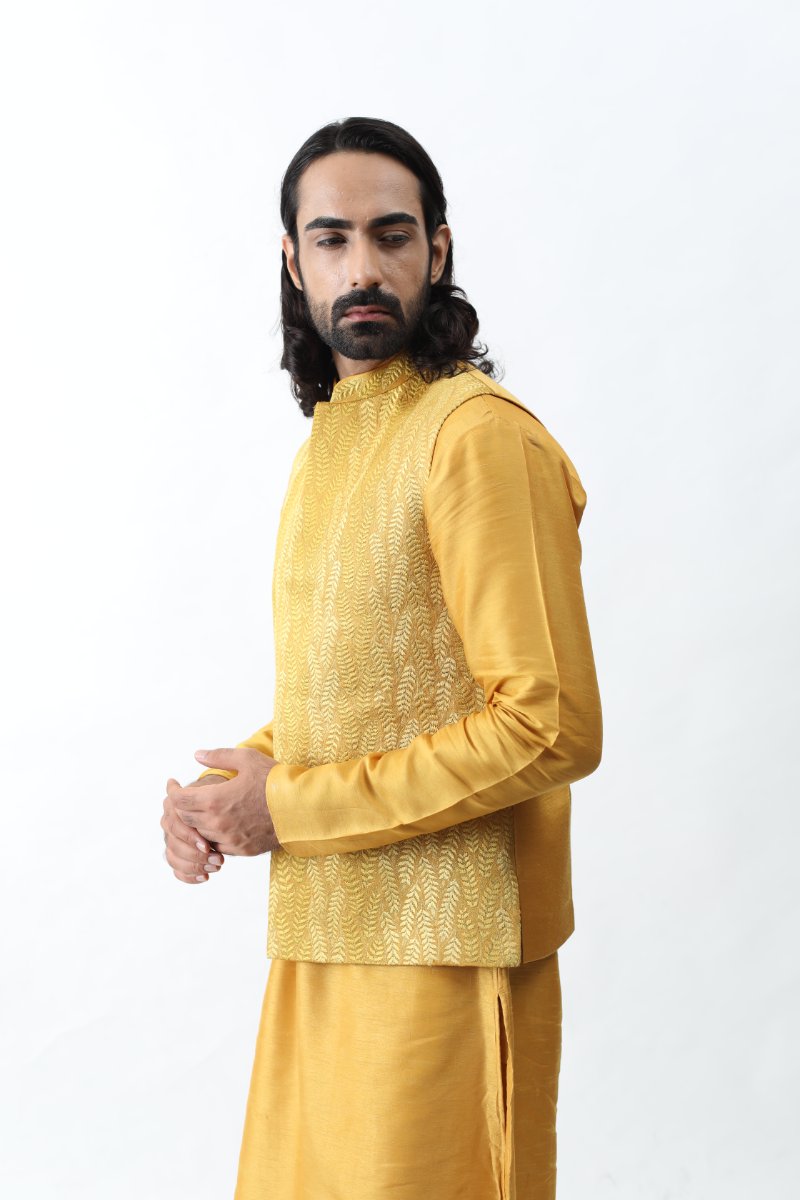 Mustard yellow Bundi with unique thread embroidery combined with an applique work mustard kurta and a pant pajama. Kurta length- 44" ,Bundi length- 28". The color may slightly vary due to screen lighting.