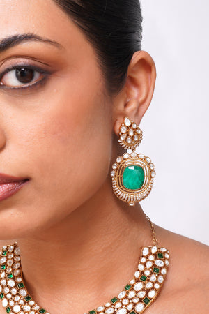 Our Emerald Kundan Collar Necklace Set, a perfect fusion of regal elegance and intricate artistry. Featuring radiant emerald stones and traditional kundan work, this bold collar-style necklace adds a majestic touch to any outfit. Comes with matching earrings to complete your luxurious look.