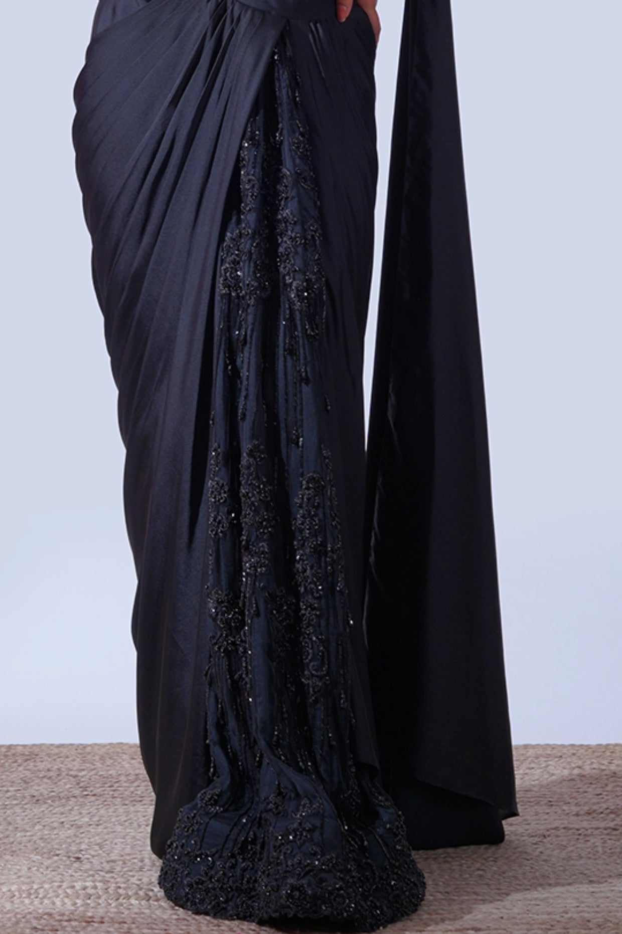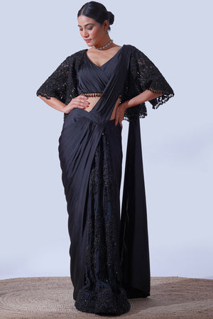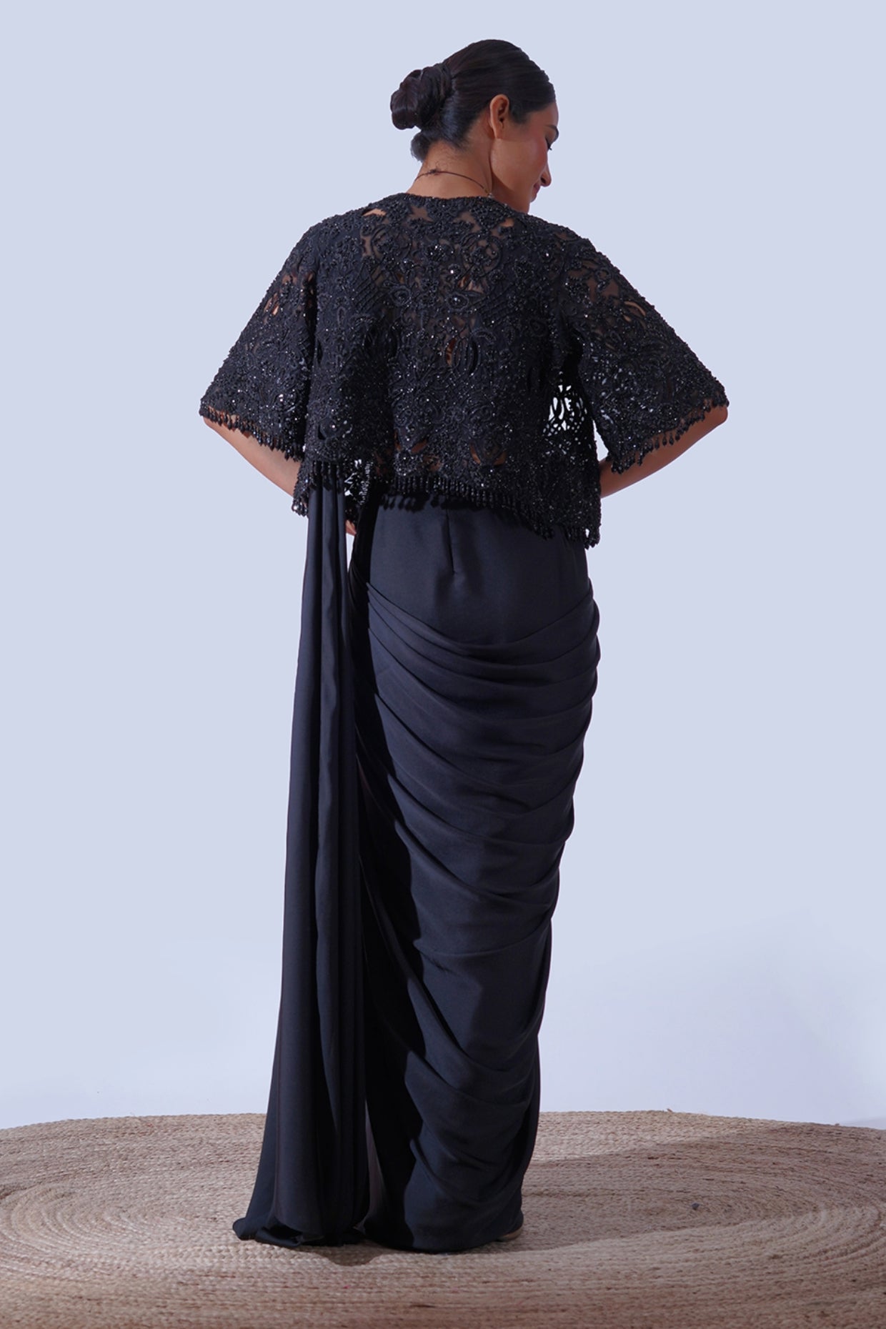 Embrace chic sophistication in our Black Predraped Saree, elegantly paired with a sleeveless draped blouse adorned with tassels. Complete the look with an intricately hand-embroidered cutwork cape, adding a touch of glamour to create a striking ensemble that effortlessly transitions from traditional to contemporary style.