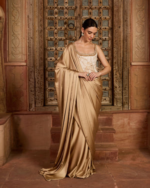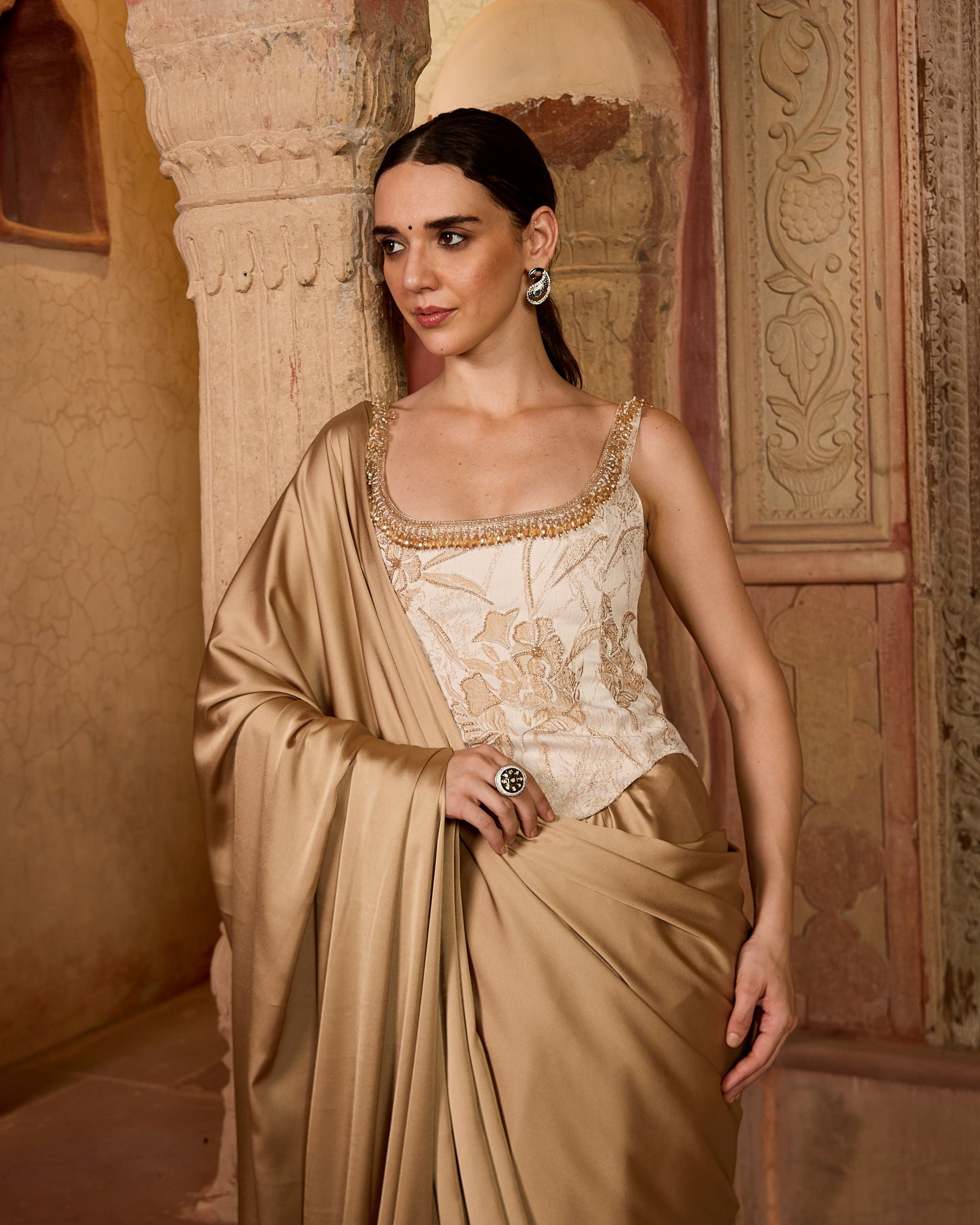 A luxurious satin gold saree with elegant hanging lace details, paired with a corseted brocade blouse embellished in intricate handwork. Regal, refined, and effortlessly glamorous.