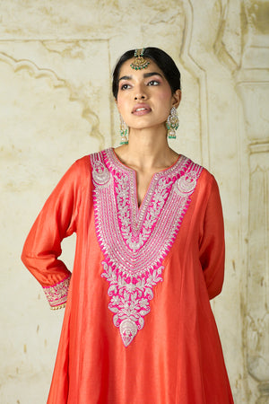 The asymmetrical kurta is adorned with intricate embroidery along the neckline, hem, and cuffs, adding a regal touch to the deep hue. Paired with a matching salwar featuring delicate motifs and a broad embroidered hemline, the ensemble captures the essence of traditional sophistication.