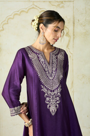 The asymmetrical kurta is adorned with intricate embroidery along the neckline, hem, and cuffs, adding a regal touch to the deep hue. Paired with a matching salwar featuring delicate motifs and a broad embroidered hemline, the ensemble captures the essence of traditional sophistication.