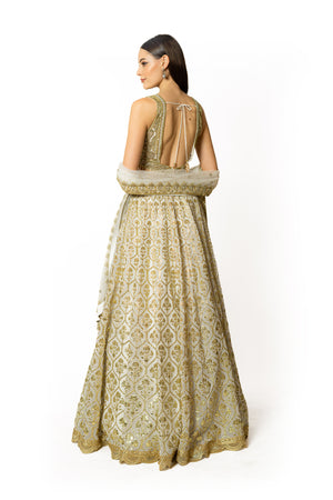 Ivory Gorgette Gota Lehenga Set W/Hand Embo. Blouse & Net Dupatta
