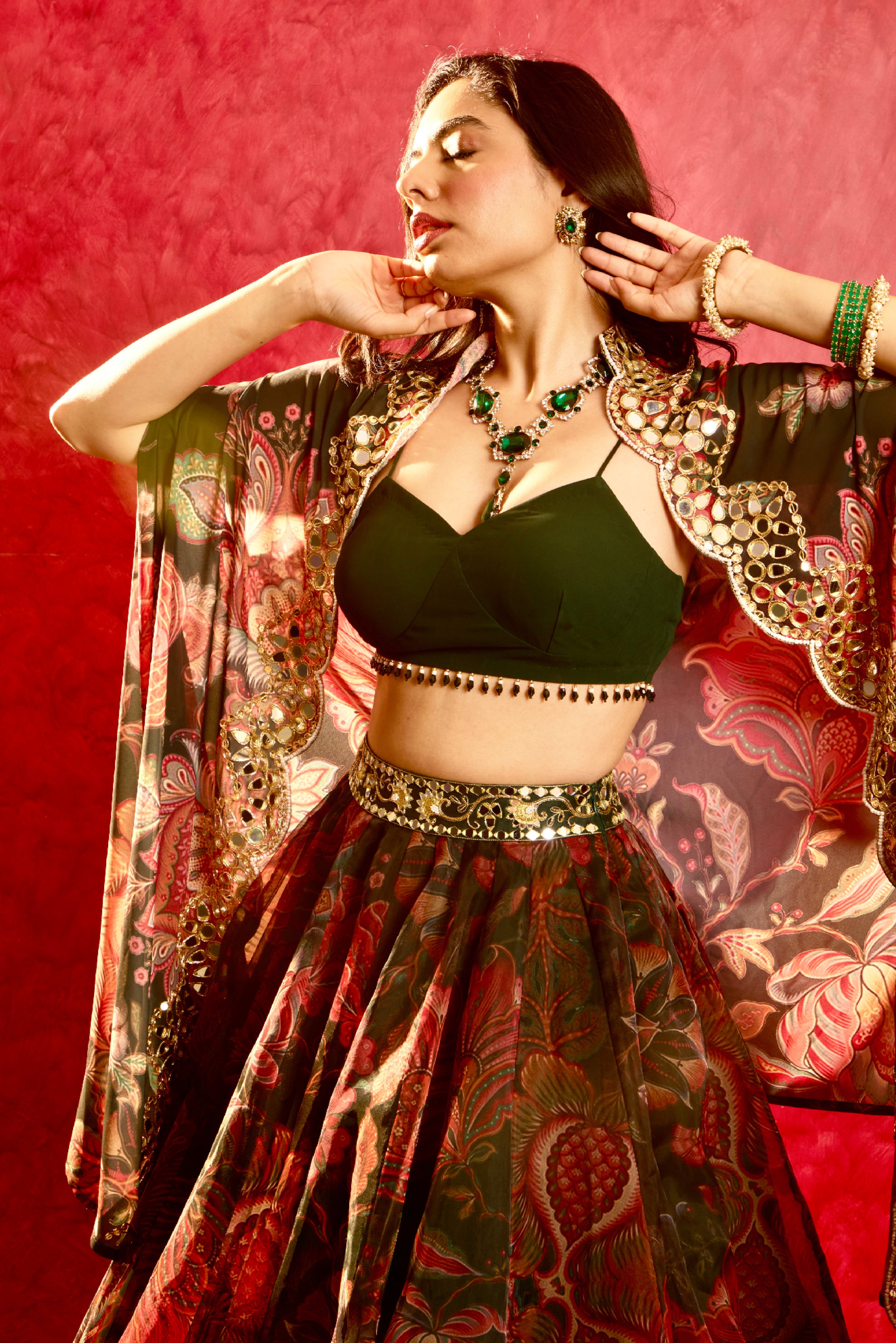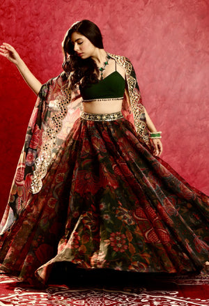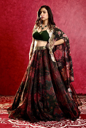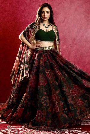 Floral Printed Green Organza Lehenga paired with Georgette Tasseled Bustier and Hand Embroidered Georgette Cape.